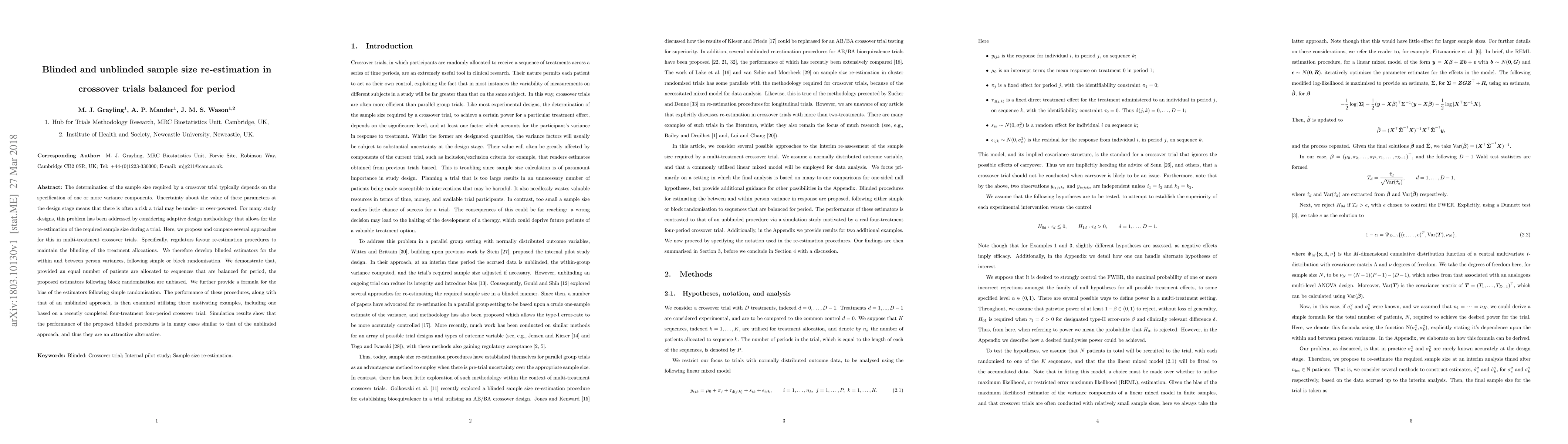 This paper proposes and evaluates adaptive sample size re-estimation methods for crossover trials, focusing on maintaining blinding of treatment allocations. The authors suggest blinded estimators for variance components and demonstrate their unbiasedness under balanced randomization, providing a formula for bias in simple randomization.