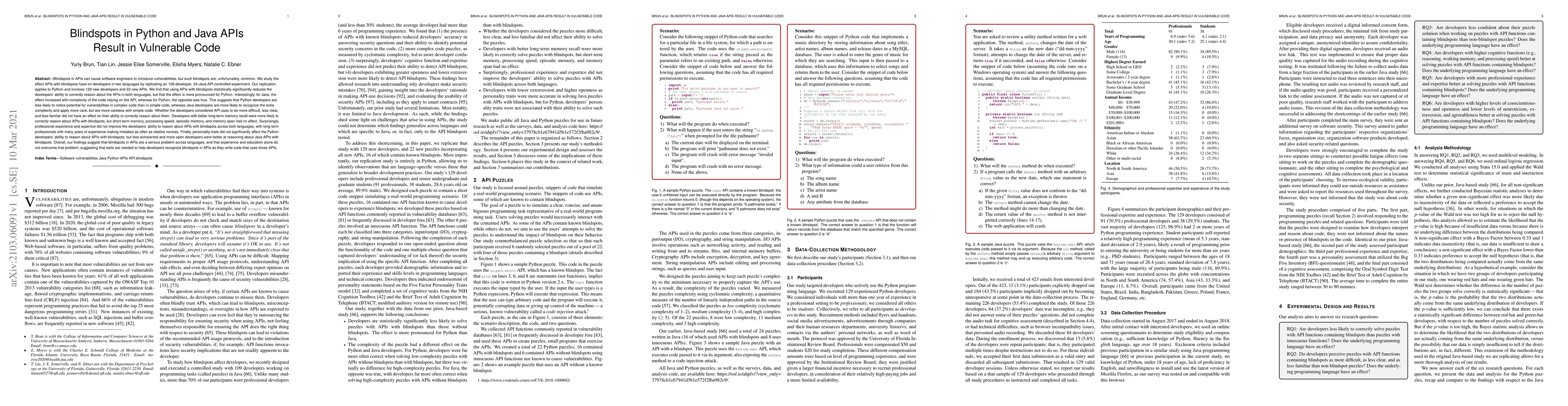 Blindspots in APIs can cause software engineers to introduce vulnerabilities, but such blindspots are, unfortunately, common. We study the effect APIs with blindspots have on developers in two languages by replicating an 109-developer, 24-Java-API controlled experiment. Our replication applies to Python and involves 129 new developers and 22 new APIs. We find that using APIs with blindspots statistically significantly reduces the developers' ability to correctly reason about the APIs in both languages, but that the effect is more pronounced for Python. Interestingly, for Java, the effect increased with complexity of the code relying on the API, whereas for Python, the opposite was true. Whether the developers considered API uses to be more difficult, less clear, and less familiar did not have an effect on their ability to correctly reason about them. Developers with better long-term memory recall were more likely to correctly reason about APIs with blindspots, but short-term memory, processing speed, episodic memory, and memory span had no effect. Surprisingly, professional experience and expertice did not improve the developers' ability to reason about APIs with blindspots across both languages, with long-term professionals with many years of experience making mistakes as often as relative novices. Finally, personality traits did not significantly affect the Python developers' ability to reason about APIs with blindspots, but less extraverted and more open developers were better at reasoning about Java APIs with blindspots. Overall, our findings suggest that blindspots in APIs are a serious problem across languages, and that experience and education alone do not overcome that problem, suggesting that tools are needed to help developers recognize blindspots in APIs as they write code that uses those APIs.