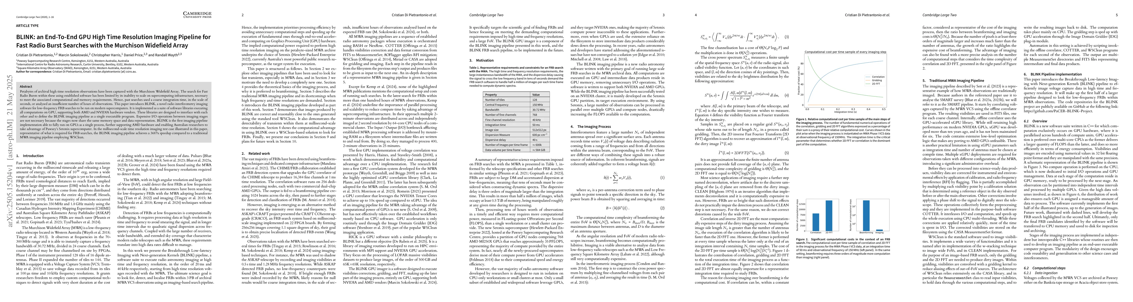 The paper introduces BLINK, a GPU-based radio interferometry imaging software for FRB searches, designed to run on modern supercomputers with support for both AMD and NVIDIA GPUs. It's implemented as interfacing libraries executing all computations on GPUs, sharing memory space and data representation between stages, eliminating expensive I/O operations.