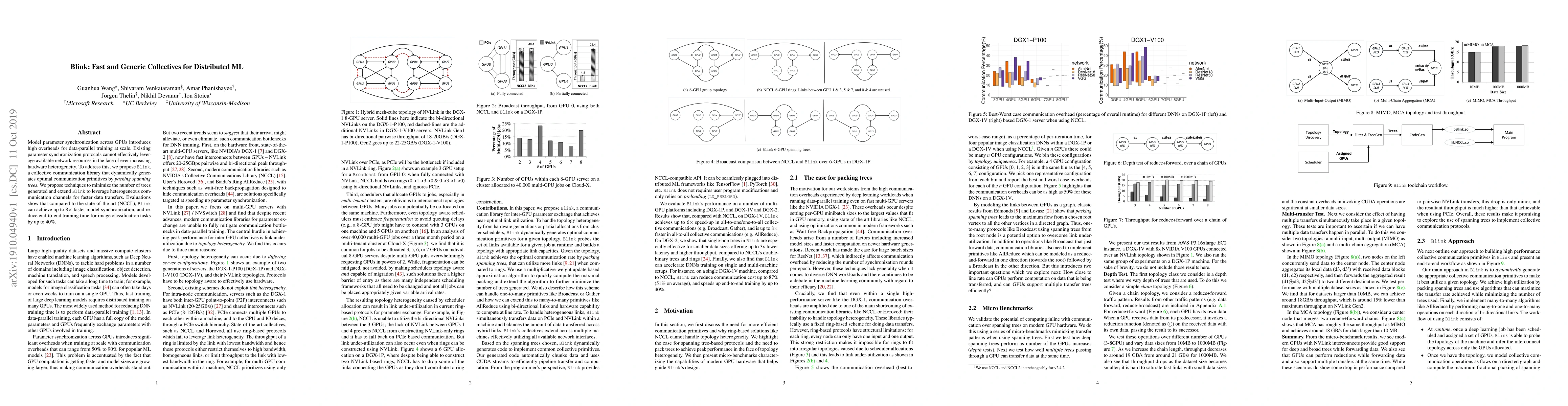 Researchers proposed Blink, a collective communication library that reduces overhead in distributed machine learning by dynamically generating optimal communication primitives. Evaluations show it can achieve up to 8x faster model synchronization than existing protocols.