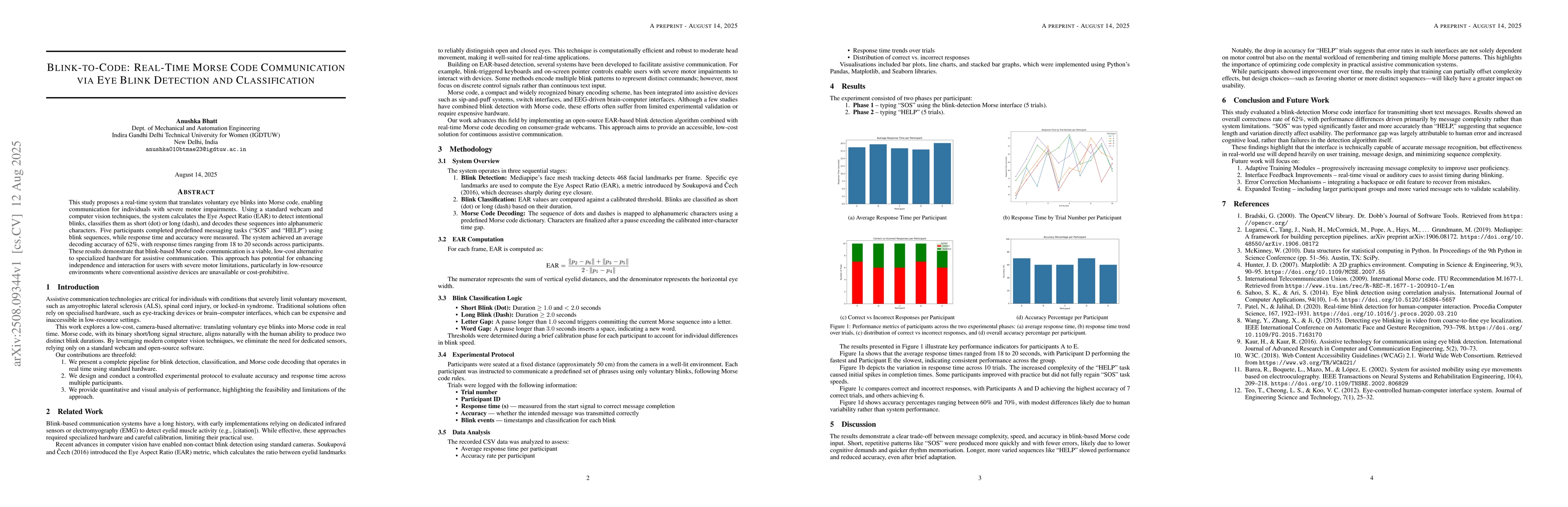 This study proposes a real-time system that translates voluntary eye blinks into Morse code, enabling communication for individuals with severe motor impairments. Using a standard webcam and computer vision, the system detects and classifies blinks as short (dot) or long (dash), then decodes them into alphanumeric characters. Experiments with five participants show 62% decoding accuracy and 18-20 seconds response times, demonstrating a viable, low-cost assistive communication method.
