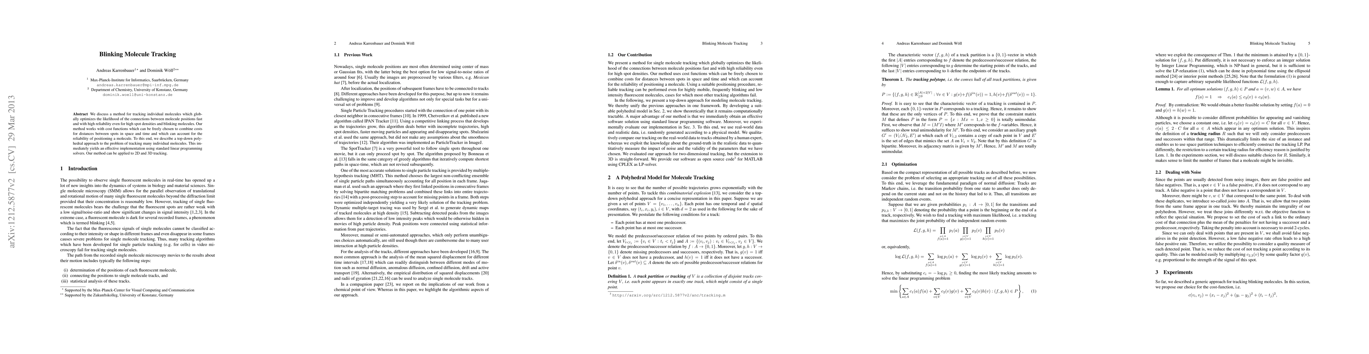 This paper presents a method for reliably tracking individual molecules, even when they blink, using a global optimization approach that combines spatial and temporal distance costs. The proposed top-down polyhedral method leverages linear programming solvers for effective implementation, applicable to both 2D and 3D tracking scenarios.
