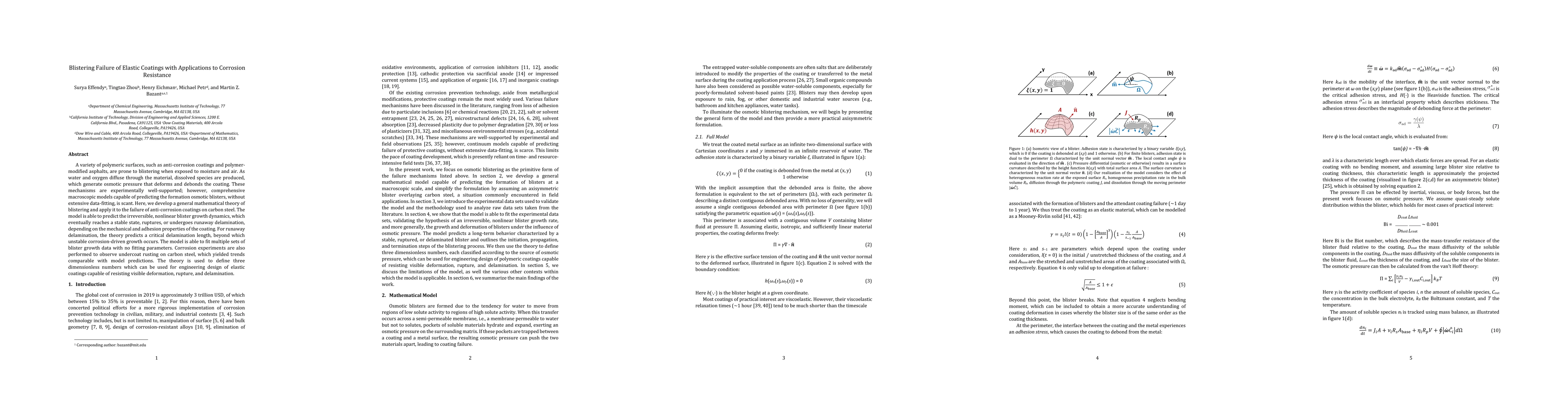 A variety of polymeric surfaces, such as anti-corrosion coatings and polymer-modified asphalts, are prone to blistering when exposed to moisture and air. As water and oxygen diffuse through the material, dissolved species are produced, which generate osmotic pressure that deforms and debonds the coating.These mechanisms are experimentally well-supported; however, comprehensive macroscopic models capable of predicting the formation osmotic blisters, without extensive data-fitting, is scant. Here, we develop a general mathematical theory of blistering and apply it to the failure of anti-corrosion coatings on carbon steel. The model is able to predict the irreversible, nonlinear blister growth dynamics, which eventually reaches a stable state, ruptures, or undergoes runaway delamination, depending on the mechanical and adhesion properties of the coating. For runaway delamination, the theory predicts a critical delamination length, beyond which unstable corrosion-driven growth occurs. The model is able to fit multiple sets of blister growth data with no fitting parameters. Corrosion experiments are also performed to observe undercoat rusting on carbon steel, which yielded trends comparable with model predictions. The theory is used to define three dimensionless numbers which can be used for engineering design of elastic coatings capable of resisting visible deformation, rupture, and delamination.