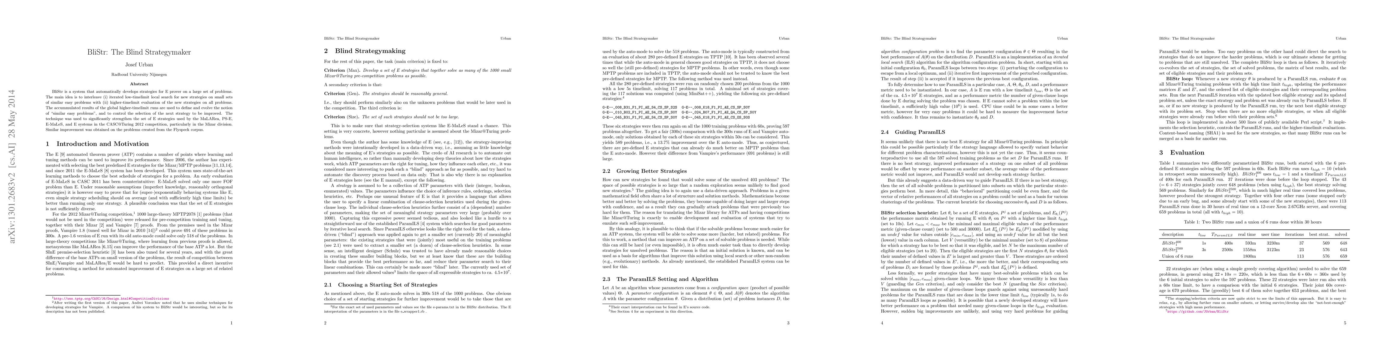 BliStr is a system that automatically develops strategies for E prover on a large set of problems. The main idea is to interleave (i) iterated low-timelimit local search for new strategies on small sets of similar easy problems with (ii) higher-timelimit evaluation of the new strategies on all problems. The accumulated results of the global higher-timelimit runs are used to define and evolve the notion of "similar easy problems", and to control the selection of the next strategy to be improved. The technique was used to significantly strengthen the set of E strategies used by the MaLARea, PS-E, E-MaLeS, and E systems in the CASC@Turing 2012 competition, particularly in the Mizar division. Similar improvement was obtained on the problems created from the Flyspeck corpus.