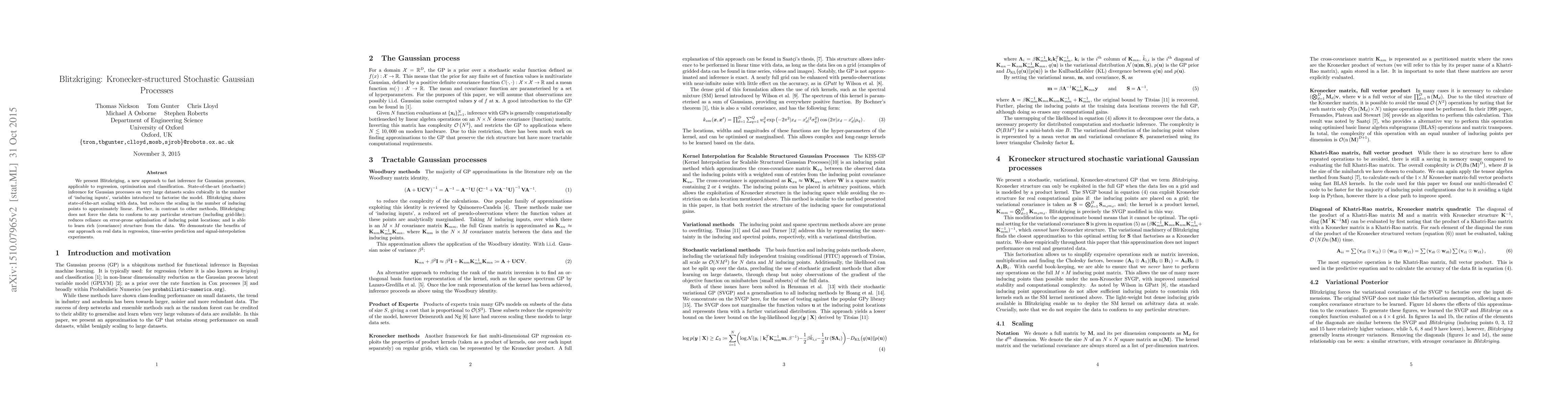 We present Blitzkriging, a new approach to fast inference for Gaussian processes, applicable to regression, optimisation and classification. State-of-the-art (stochastic) inference for Gaussian processes on very large datasets scales cubically in the number of 'inducing inputs', variables introduced to factorise the model. Blitzkriging shares state-of-the-art scaling with data, but reduces the scaling in the number of inducing points to approximately linear. Further, in contrast to other methods, Blitzkriging: does not force the data to conform to any particular structure (including grid-like); reduces reliance on error-prone optimisation of inducing point locations; and is able to learn rich (covariance) structure from the data. We demonstrate the benefits of our approach on real data in regression, time-series prediction and signal-interpolation experiments.