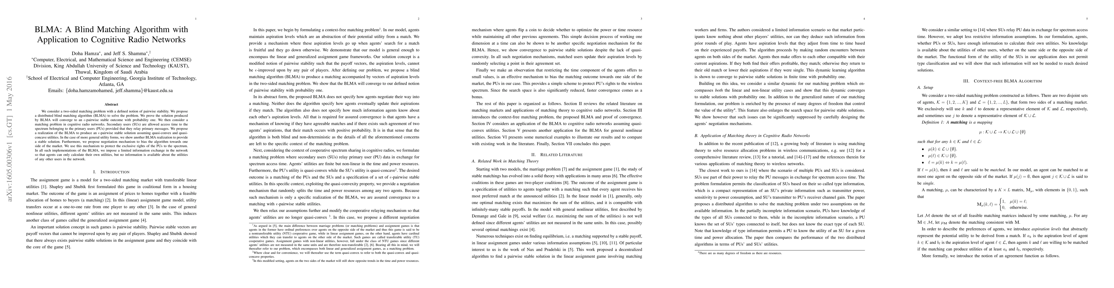 We consider a two-sided matching problem with a defined notion of pairwise stability. We propose a distributed blind matching algorithm (BLMA) to solve the problem. We prove the solution produced by BLMA will converge to an $\epsilon$-pairwise stable outcome with probability one. We then consider a matching problem in cognitive radio networks. Secondary users (SUs) are allowed access time to the spectrum belonging to the primary users (PUs) provided that they relay primary messages. We propose a realization of the BLMA to produce an $\epsilon$-pairwise stable solution assuming quasi-convex and quasi-concave utilities. In the case of more general utility forms, we show another BLMA realization to provide a stable solution. Furthermore, we propose negotiation mechanism to bias the algorithm towards one side of the market. We use this mechanism to protect the exclusive rights of the PUs to the spectrum. In all such implementations of the BLMA, we impose a limited information exchange in the network so that agents can only calculate their own utilities, but no information is available about the utilities of any other users in the network.