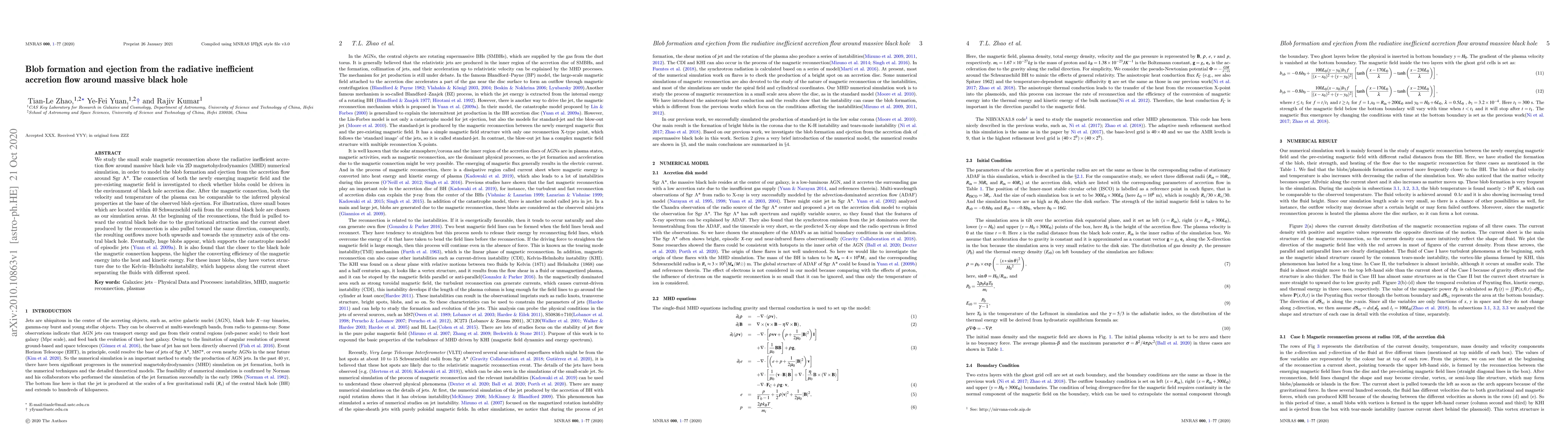 We study the small scale magnetic reconnection above the radiative inefficient accretion flow around massive black hole via 2D magnetohydrodynamics (MHD) numerical simulation, in order to model the blob formation and ejection from the accretion flow around Sgr A*. The connection of both the newly emerging magnetic field and the pre-existing magnetic field is investigated to check whether blobs could be driven in the environment of black hole accretion disc. After the magnetic connection, both the velocity and temperature of the plasma can be comparable to the inferred physical properties at the base of the observed blob ejection. For illustration, three small boxes which are located within 40 Schwarzschild radii from the central black hole are chosen as our simulation areas. At the beginning of the reconnections, the fluid is pulled toward the central black hole due to the gravitational attraction and the current sheet produced by the reconnection is also pulled toward the same direction, consequently, the resulting outflows move both upwards and towards the symmetry axis of the central black hole. Eventually, huge blobs appear, which supports the catastrophe model of episodic jets \citep{2009MNRAS.395.2183Y}. It is also found that the closer to the black hole the magnetic connection happens, the higher the converting efficiency of the magnetic energy into the heat and kinetic energy. For these inner blobs, they have vortex structure due to the K-H instability, which happens along the current sheet separating the fluids with different speed.