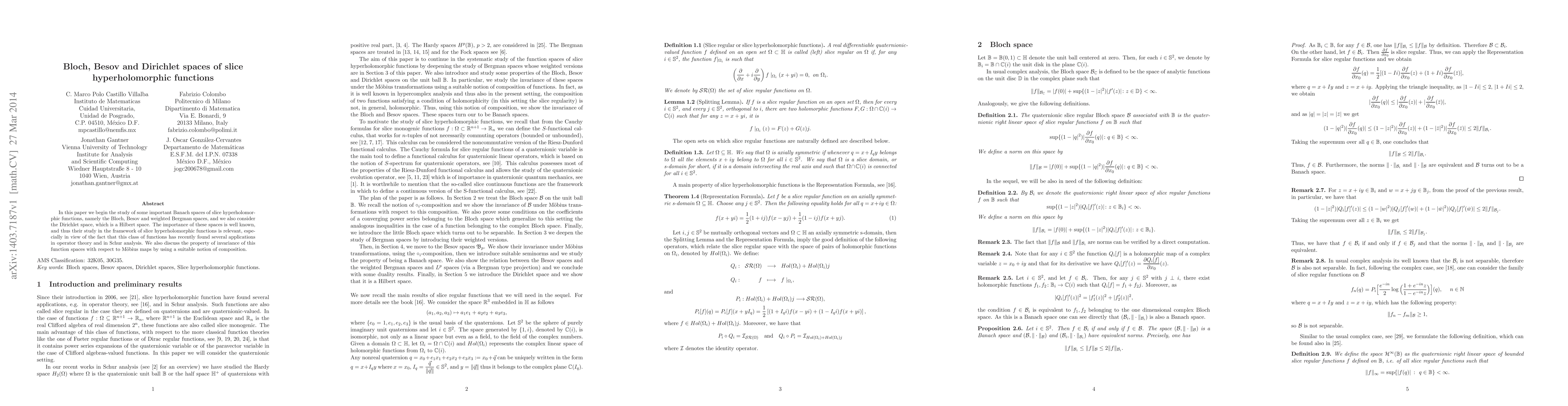 This paper investigates Banach spaces of slice hyperholomorphic functions, including the Bloch, Besov, and weighted Bergman spaces, as well as the Dirichlet space, focusing on their properties and invariance under Moebius maps, highlighting their relevance in operator theory and Schur analysis.
