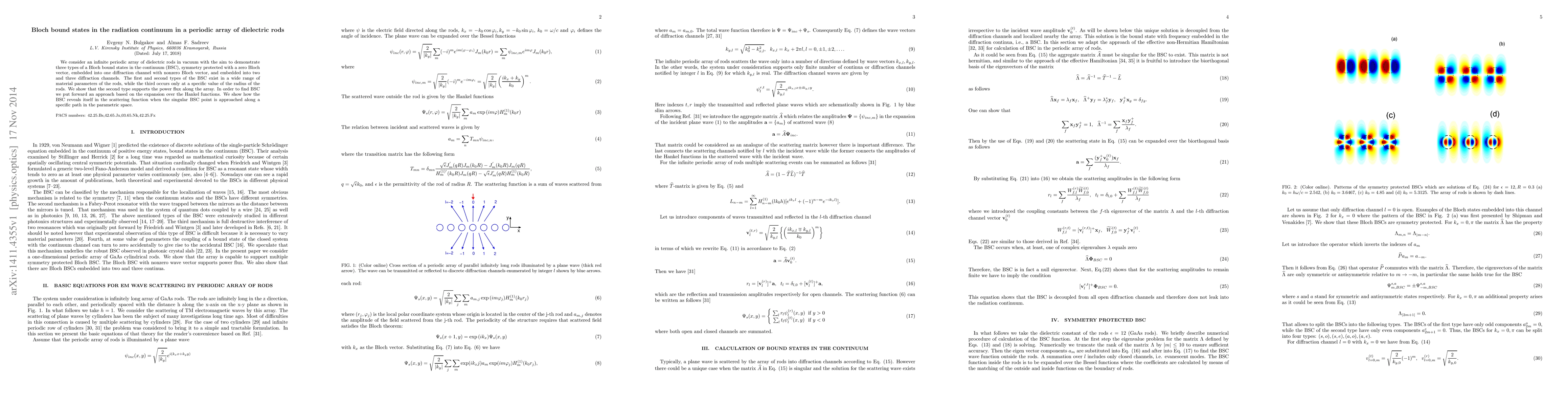 This paper investigates Bloch bound states in the radiation continuum within a periodic array of dielectric rods, identifying three types of states protected by symmetry. The second type supports power flux along the array, and the study employs an approach based on Hankel function expansion to reveal these states in the scattering function.