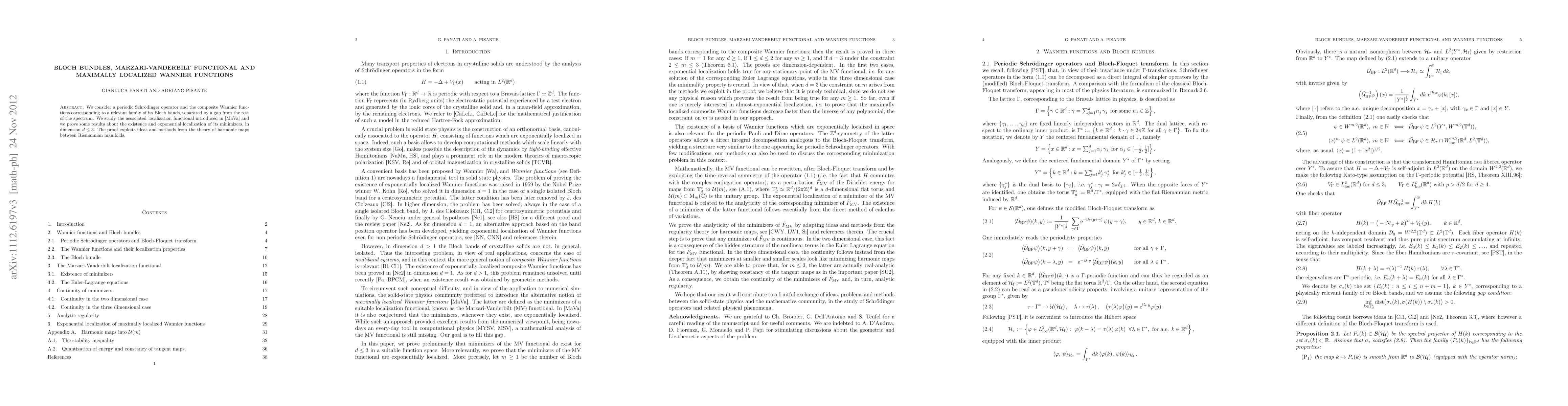 This research paper explores the properties of composite Wannier functions related to specific energy bands of a periodic Schroedinger operator, separated from other spectrum. It proves the existence and exponential localization of minimizers for the Marzari-Vanderbilt functional in dimensions less than 4, using harmonic maps theory from Riemannian manifolds.