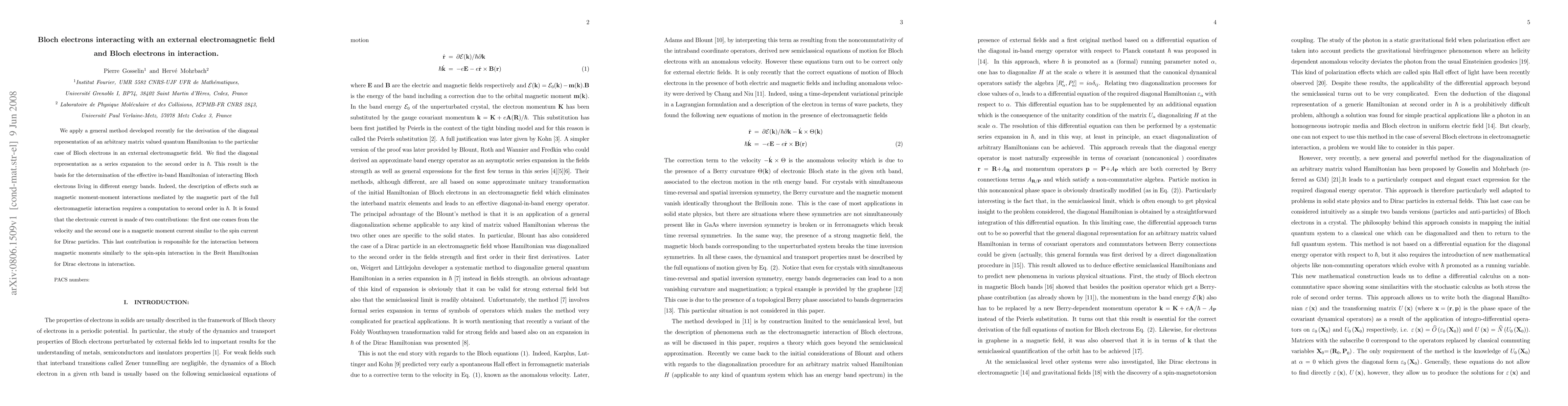 We apply a general method developed recently for the derivation of the diagonal representation of an arbitrary matrix valued quantum Hamiltonian to the particular case of Bloch electrons in an external electromagnetic field. We find the diagonal representation as a series expansion to the second order in $\hbar .$ This result is the basis for the determination of the effective in-band Hamiltonian of interacting Bloch electrons living in different energy bands. Indeed, the description of effects such as magnetic moment-moment interactions mediated by the magnetic part of the full electromagnetic interaction requires a computation to second order in $\hbar $. It is found that the electronic current is made of two contributions: the first one comes from the velocity and the second one is a magnetic moment current similar to the spin current for Dirac particles. This last contribution is responsible for the interaction between magnetic moments similarly to the spin-spin interaction in the Breit Hamiltonian for Dirac electrons in interaction.