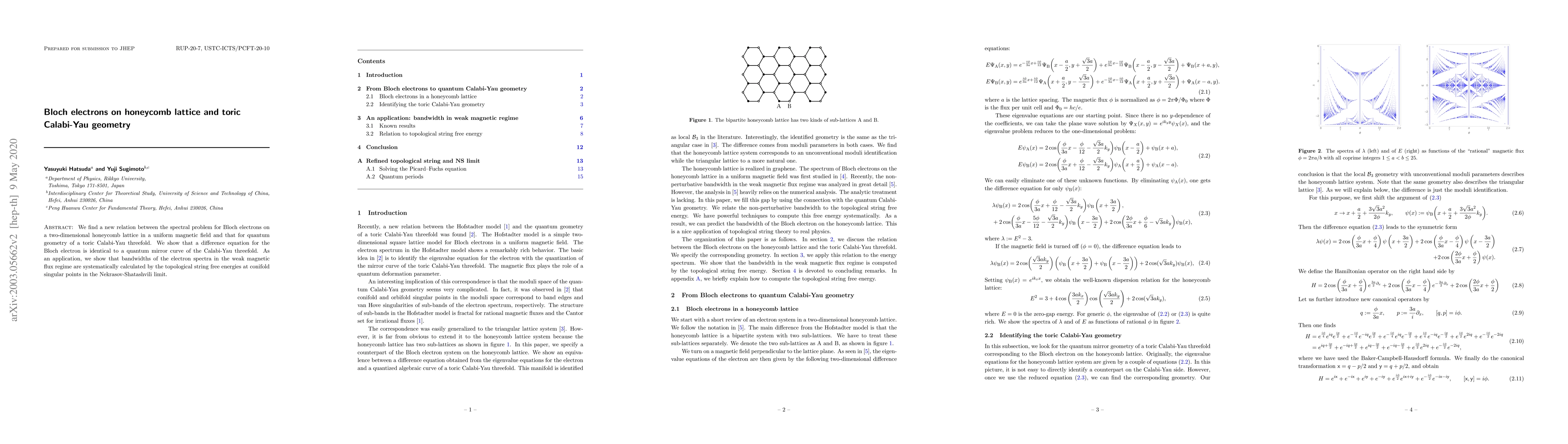 This research reveals a novel equivalence between the spectral problem for Bloch electrons on a honeycomb lattice under a magnetic field and the quantum geometry of a toric Calabi-Yau threefold, showing that their difference equations are identical. The study also applies this relation to calculate electron spectra bandwidths using topological string free energies.