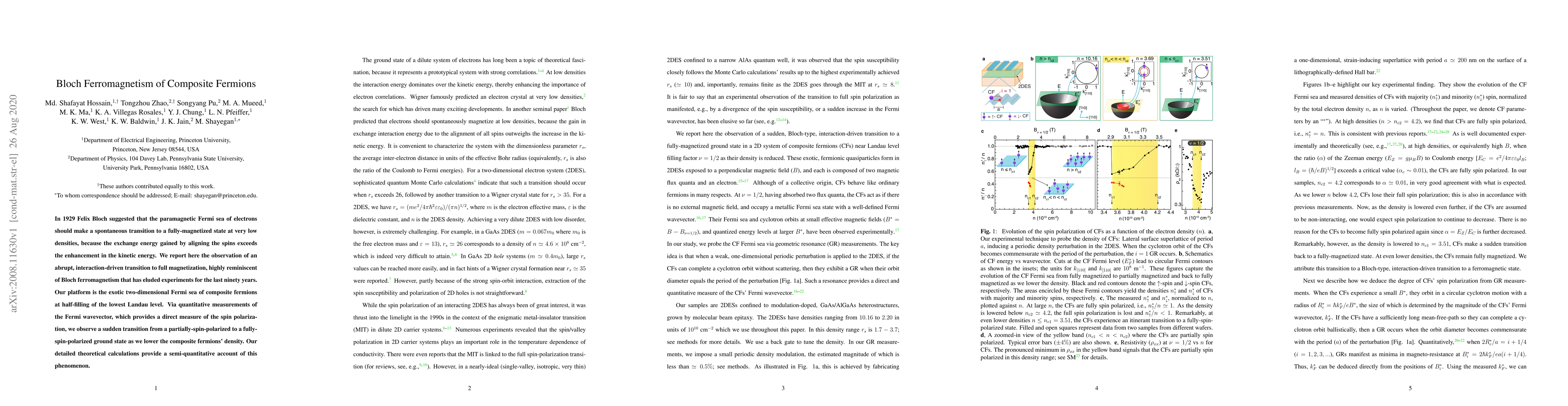 This paper reports the first experimental observation of Bloch ferromagnetism in a two-dimensional Fermi sea of composite fermions at half-filling, demonstrating a transition to full magnetization driven by interactions. Theoretical calculations support the findings, providing a semi-quantitative explanation for this long-elusive phenomenon.