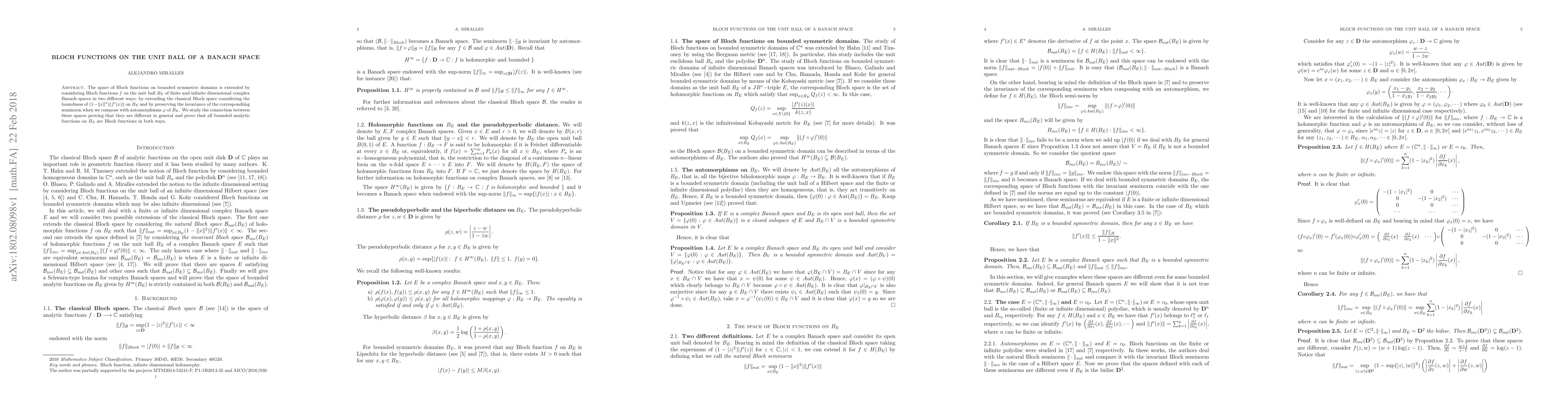 This paper extends the concept of Bloch functions to the unit ball of Banach spaces and explores two distinct definitions: one based on the boundedness of $(1-\|x\|^2) \|f'(x)\|$ and the other preserving seminorm invariance under automorphisms. The study reveals that these definitions yield different spaces, while proving that all bounded analytic functions on $B_E$ satisfy both definitions.