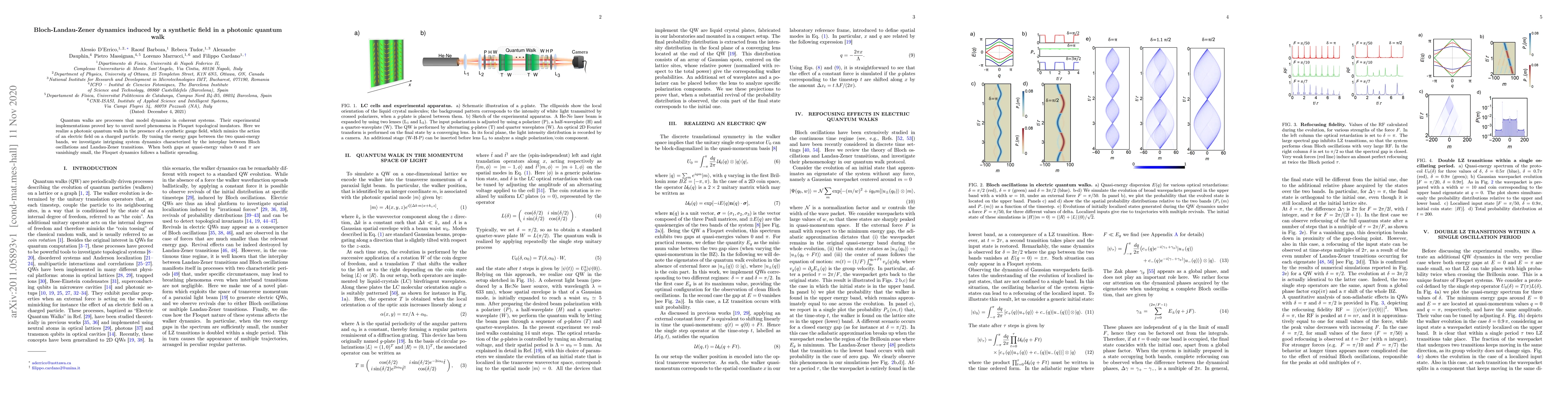 This paper investigates photonic quantum walks in synthetic gauge fields, revealing dynamics combining Bloch oscillations and Landau-Zener transitions. The study finds that when energy gaps at quasi-energy values 0 and $\pi$ are minimal, the system exhibits ballistic spreading.