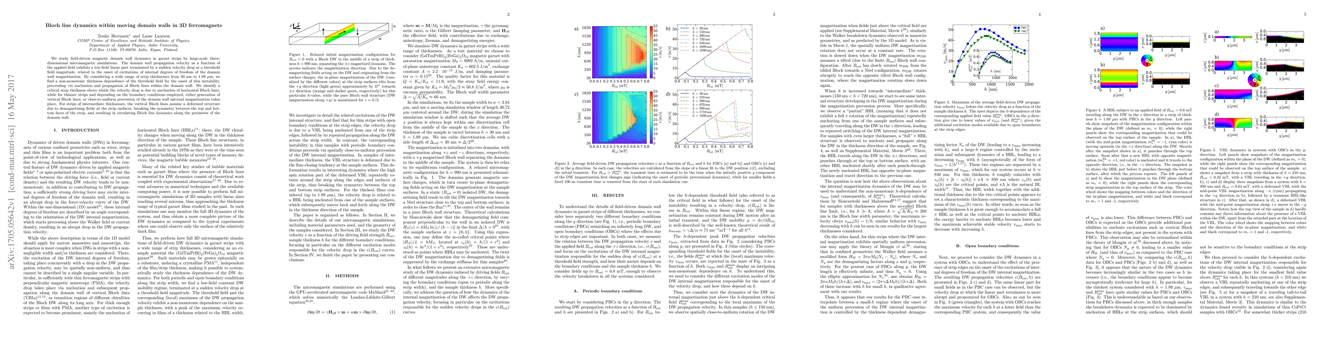 This study investigates the dynamics of Bloch lines within moving magnetic domain walls in 3D ferromagnets using micromagnetic simulations. The research reveals a non-monotonic relationship between strip thickness and the threshold field for Bloch line excitation, with different mechanisms dominating in thin, intermediate, and thick strips.
