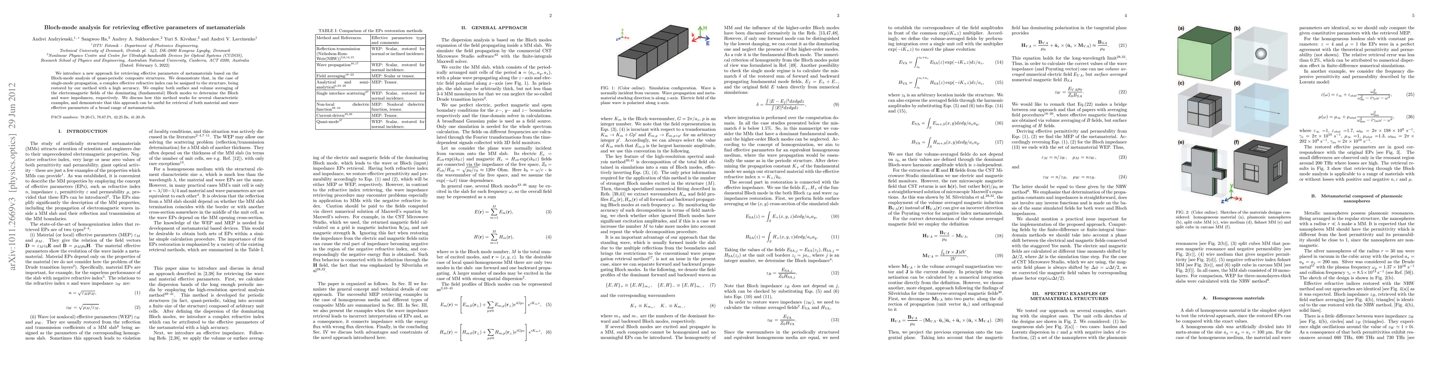 This paper proposes a Bloch-mode analysis method for accurately retrieving effective parameters of metamaterials by employing surface and volume averaging of electromagnetic fields. The approach demonstrates high accuracy in determining complex effective refractive indices and is applicable to a wide range of metamaterial structures.