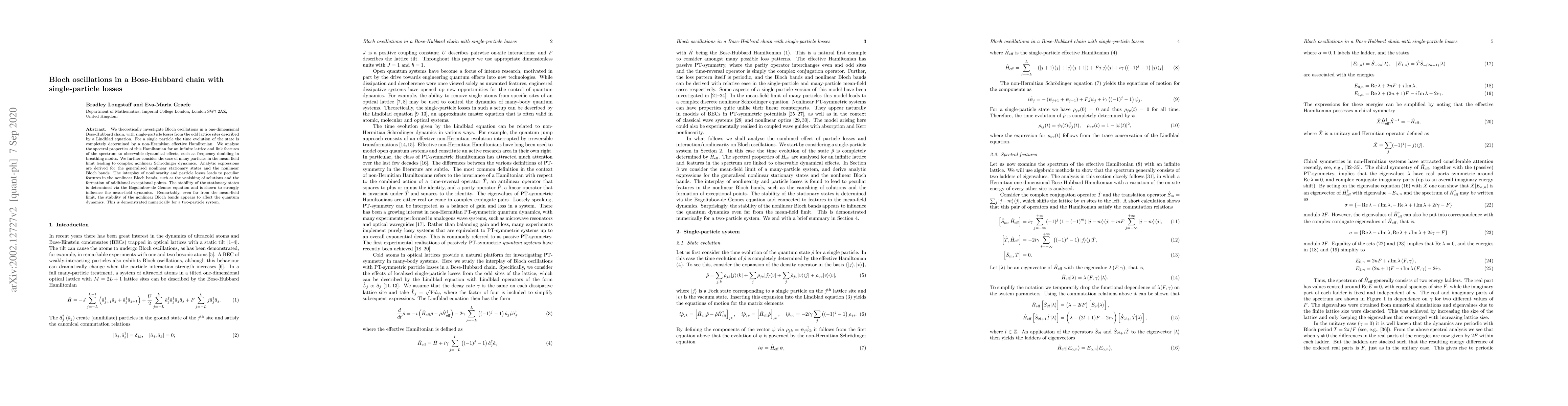 We theoretically investigate Bloch oscillations in a one-dimensional Bose-Hubbard chain, with single-particle losses from the odd lattice sites described by the Lindblad equation. For a single particle the time evolution of the state is completely determined by a non-Hermitian effective Hamiltonian. We analyse the spectral properties of this Hamiltonian for an infinite lattice and link features of the spectrum to observable dynamical effects, such as frequency doubling in breathing modes. We further consider the case of many particles in the mean-field limit leading to complex nonlinear Schr\"odinger dynamics. Analytic expressions are derived for the generalised nonlinear stationary states and the nonlinear Bloch bands. The interplay of nonlinearity and particle losses leads to peculiar features in the nonlinear Bloch bands, such as the vanishing of solutions and the formation of additional exceptional points. The stability of the stationary states is determined via the Bogoliubov-de Gennes equation and is shown to strongly influence the mean-field dynamics. Remarkably, even far from the mean-field limit, the stability of the nonlinear Bloch bands appears to affect the quantum dynamics. This is demonstrated numerically for a two-particle system.