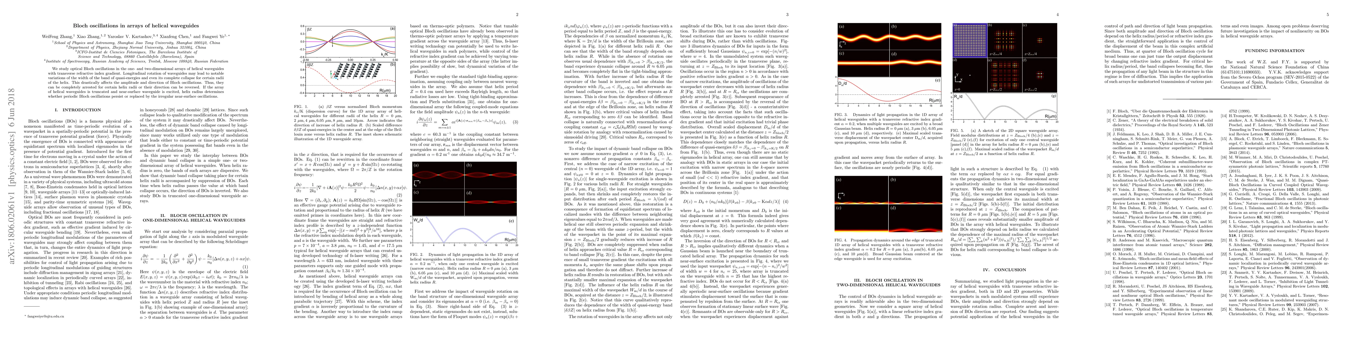 We study optical Bloch oscillations in the one- and two-dimensional arrays of helical waveguides with transverse refractive index gradient. Longitudinal rotation of waveguides may lead to notable variations of the width of the band of quasi-energies and even its complete collapse for certain radii of the helix. This drastically affects the amplitude and direction of Bloch oscillations. Thus, they can be completely arrested for certain helix radii or their direction can be reversed. If the array of helical waveguides is truncated and near-surface waveguide is excited, helix radius determines whether periodic Bloch oscillations persist or replaced by the irregular near-surface oscillations.