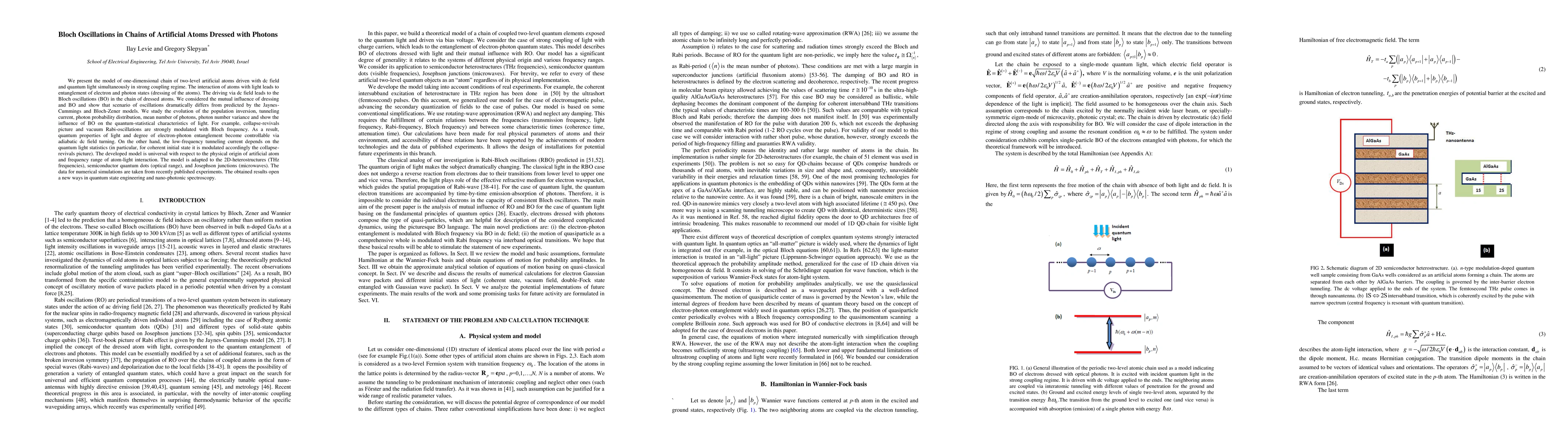 This paper models a one-dimensional chain of artificial atoms interacting with quantum light and a dc field, demonstrating Bloch oscillations influenced by photon-induced dressing. The study reveals significant deviations from existing models and highlights the controllability of quantum properties and entanglement via the dc field, with implications for quantum state engineering and nano-photonic spectroscopy.