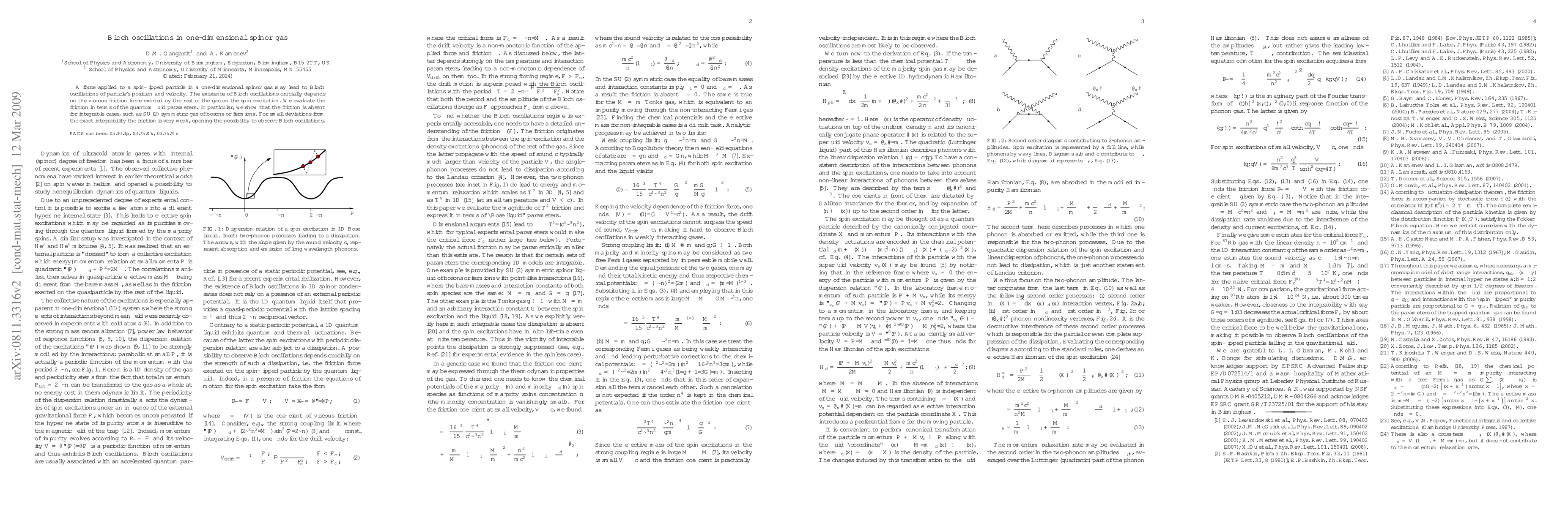 A force applied to a spin-flipped particle in a one-dimensional spinor gas may lead to Bloch oscillations of particle's position and velocity. The existence of Bloch oscillations crucially depends on the viscous friction force exerted by the rest of the gas on the spin excitation. We evaluate the friction in terms of the quantum fluid parameters. In particular, we show that the friction is absent for integrable cases, such as SU(2) symmetric gas of bosons or fermions. For small deviations from the exact integrability the friction is very weak, opening the possibility to observe Bloch oscillations.