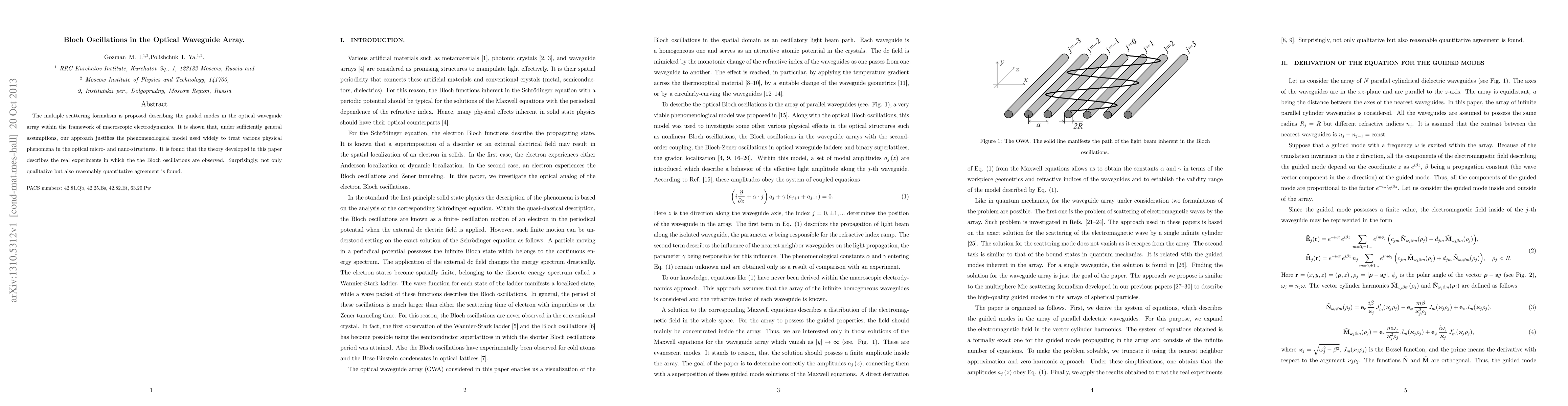 The multiple scattering formalism is proposed describing the guided modes in the optical waveguide array within the framework of macroscopic electrodynamics. It is shown that, under sufficiently general assumptions, our approach justifies the phenomenological model used widely to treat various physical phenomena in the optical micro- and nano-structures. It is found that the theory developed in this paper describes the real experiments in which the the Bloch oscillations are observed. Surprisingly, not only qualitative but also reasonably quantitative agreement is found.