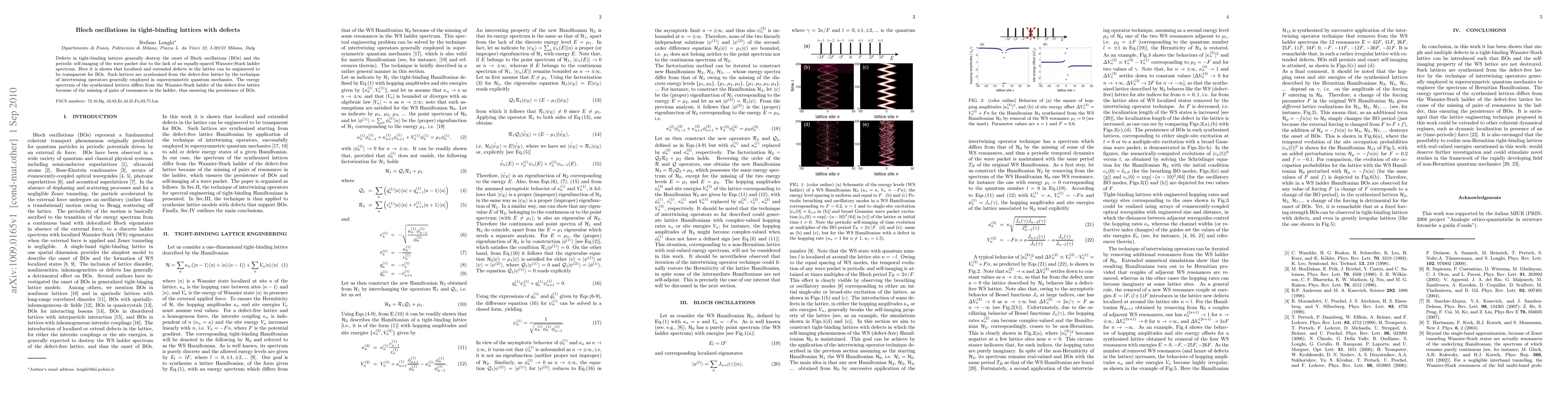 This paper demonstrates that engineered localized or extended defects in tight-binding lattices can maintain Bloch oscillations by using intertwining operators, preserving the periodic self-imaging despite the altered energy spectrum due to missing resonance pairs.