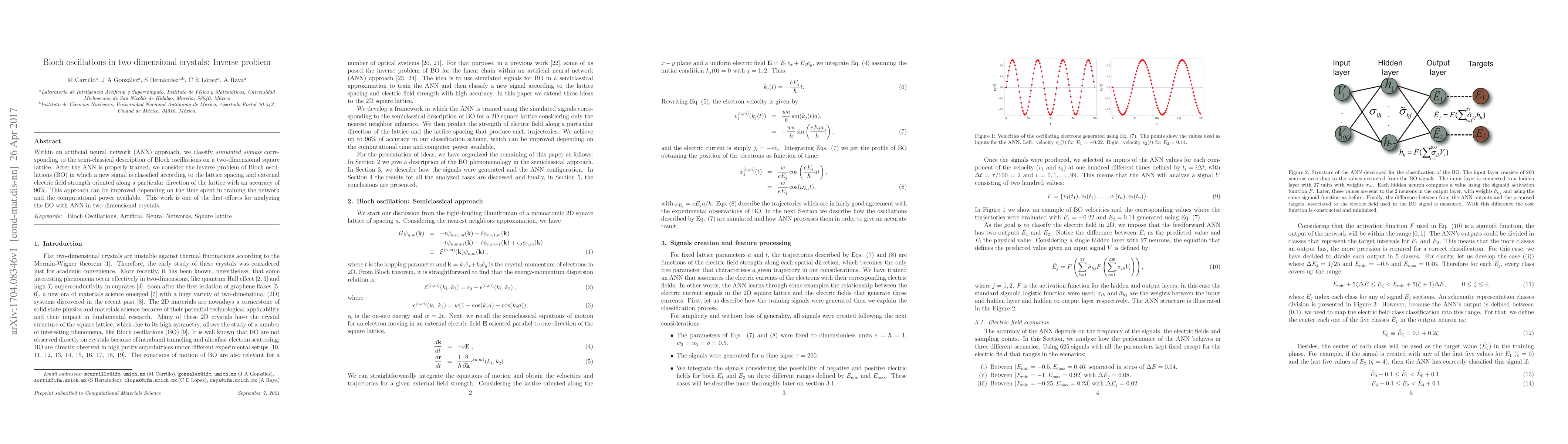 This paper uses an artificial neural network to classify signals from Bloch oscillations in two-dimensional square lattices, achieving 96% accuracy in determining lattice spacing and electric field strength. The study represents an initial effort to analyze Bloch oscillations via neural networks in two-dimensional crystals.