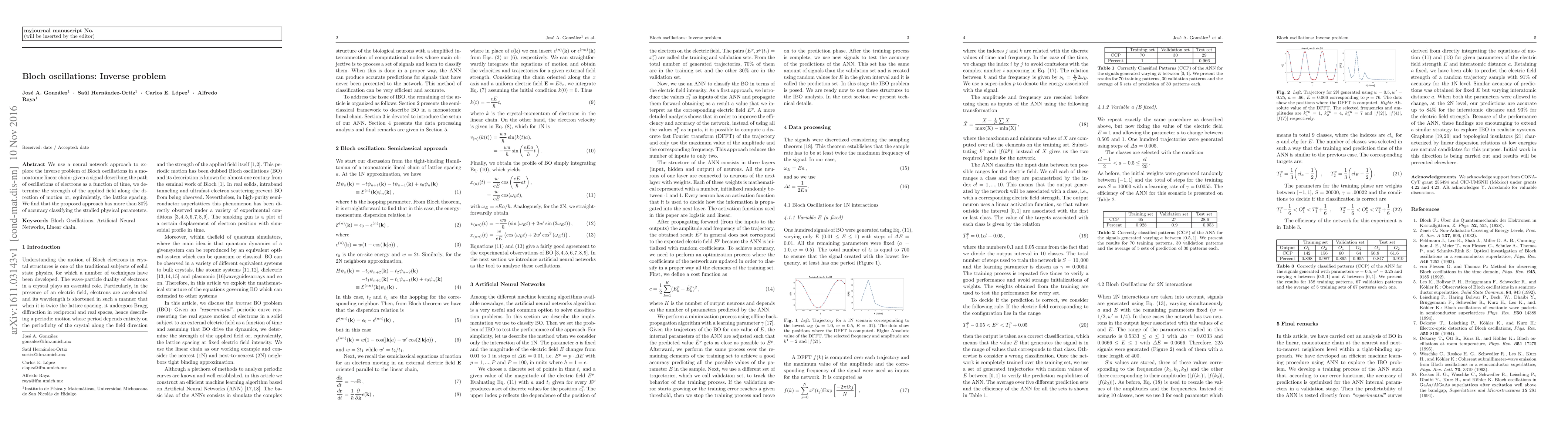 We use a neural network approach to explore the inverse problem of Bloch oscillations in a monoatomic linear chain: given a signal describing the path of oscillations of electrons as a function of time, we determine the strength of the applied field along the direction of motion or, equivalently, the lattice spacing. We find that the proposed approach has more than 80% of accuracy classifying the studied physical parameters.