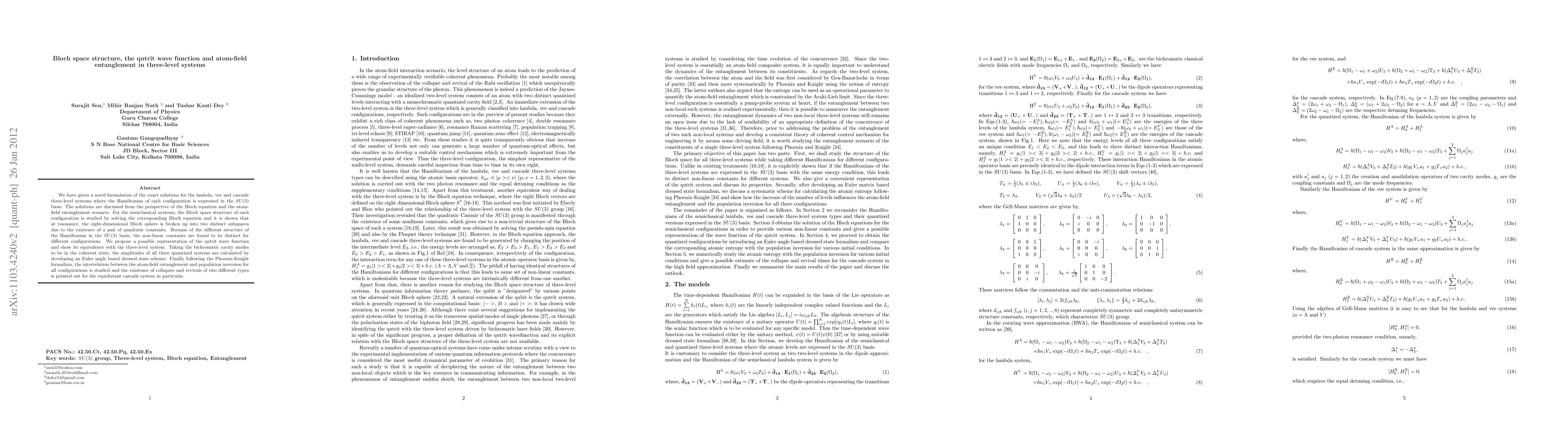This paper presents exact solutions for lambda, vee, and cascade three-level systems using the SU(3) basis and explores their Bloch space structure and atom-field entanglement. It reveals the breakdown of the eight-dimensional Bloch sphere into two subspaces at resonance and proposes a representation of the qutrit wave function.