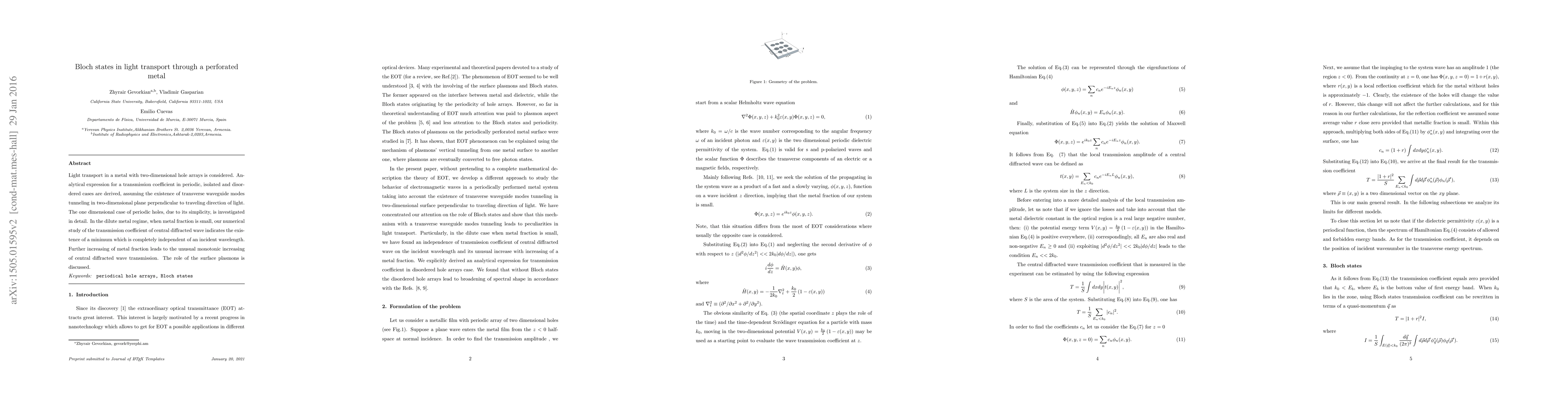 This paper derives analytical expressions for light transmission through metal with 2D hole arrays, focusing on a 1D periodic case. It reveals a wavelength-independent transmission minimum in dilute metals and an unusual monotonic increase with higher metal fraction. The role of surface plasmons is also discussed.
