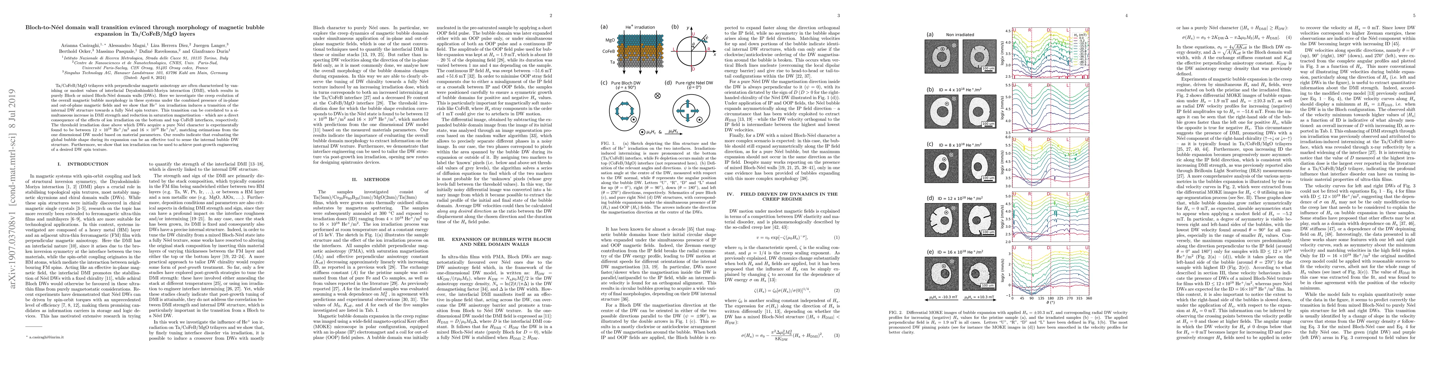 This study investigates the transition of domain wall (DW) structures in Ta/CoFeB/MgO trilayers from predominantly Bloch to fully N\'eel under He$^+$ ion irradiation. The research demonstrates that the global bubble morphology during expansion can effectively indicate this transition, correlating it to changes in the Dzyaloshinskii-Moriya interaction strength and saturation magnetisation due to ion-induced interface modifications.