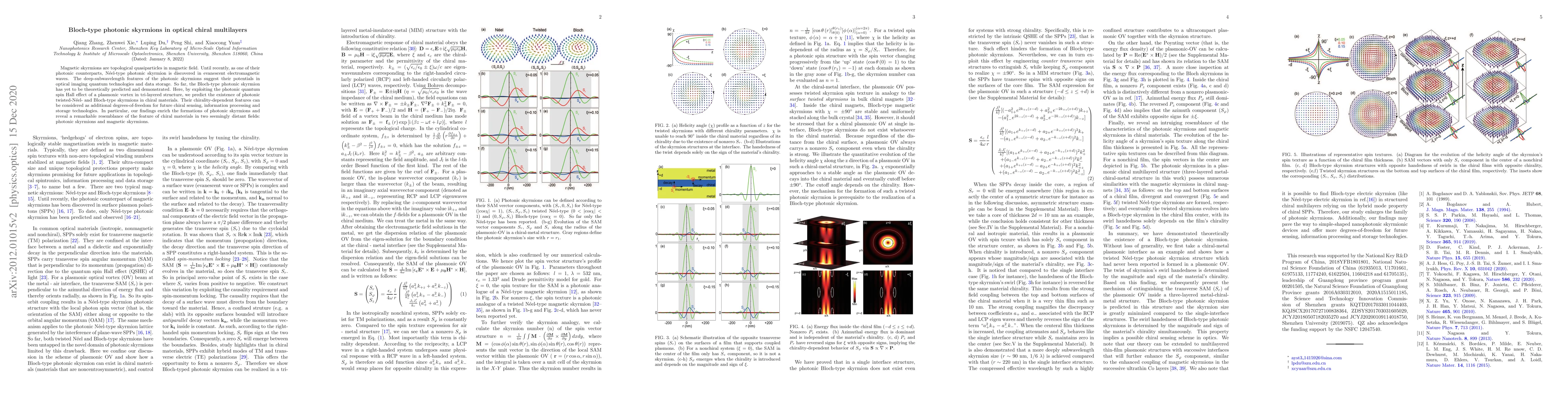 This paper demonstrates the existence of Bloch-type photonic skyrmions in optical chiral multilayers, expanding the family of photonic skyrmions and highlighting their potential for quantum technologies and data storage. The study reveals a striking similarity between photonic and magnetic skyrmions, suggesting new applications in chiral sensing and information processing.
