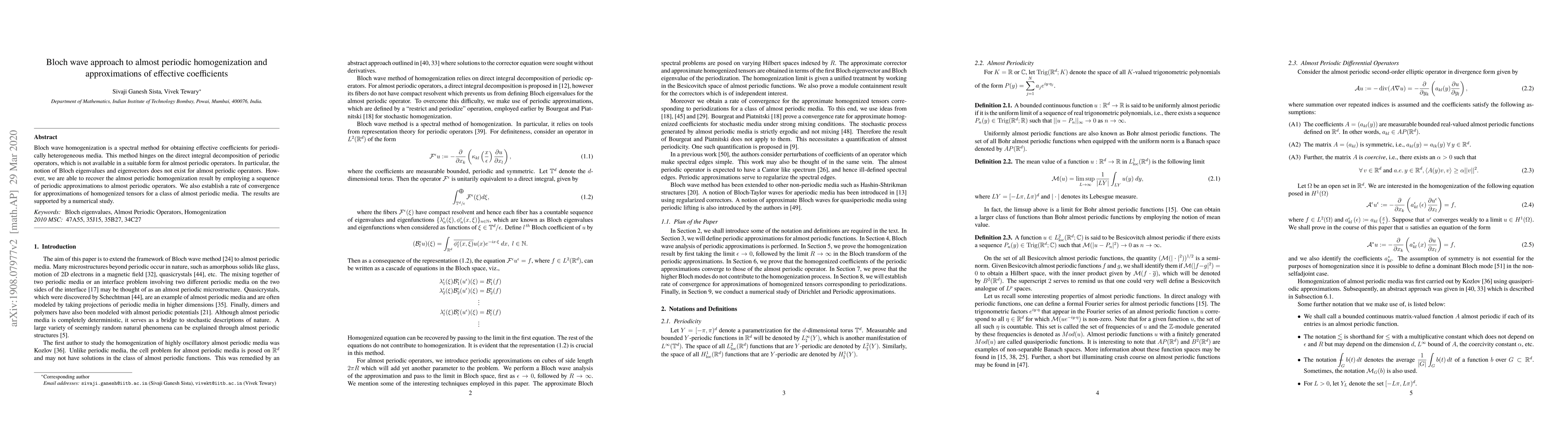 Bloch wave homogenization is a spectral method for obtaining effective coefficients for periodically heterogeneous media. This method hinges on the direct integral decomposition of periodic operators, which is not available in a suitable form for almost periodic operators. In particular, the notion of Bloch eigenvalues and eigenvectors does not exist for almost periodic operators. However, we are able to recover the homogenization result in this case, by employing a sequence of periodic approximations to almost periodic operators. We also establish a rate of convergence for approximations of homogenized tensors for a class of almost periodic media. The results are supported by a numerical study.