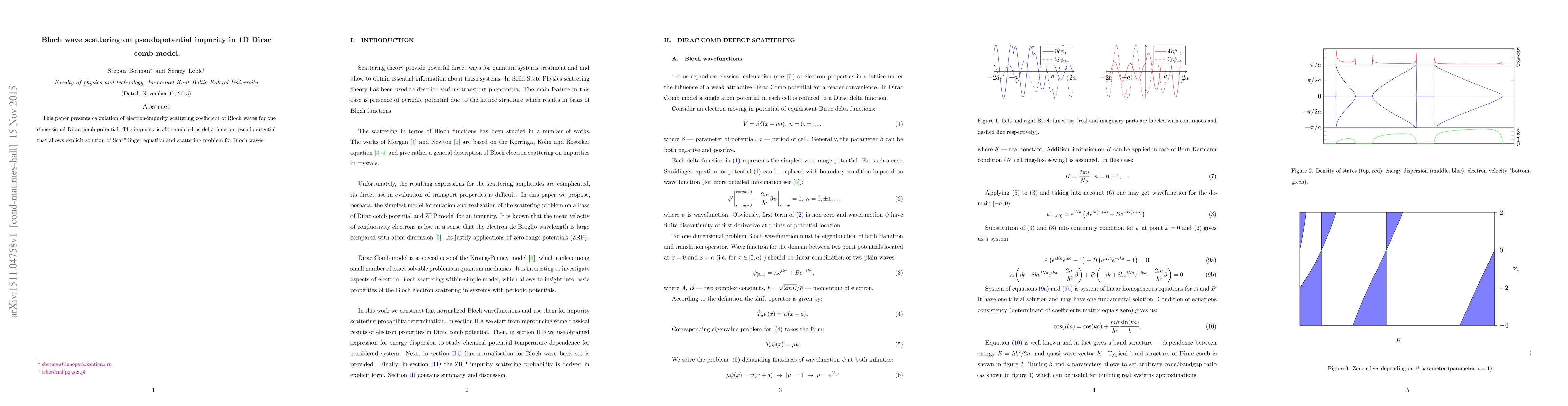 This paper presents calculation of electron-impurity scattering coefficient of Bloch waves for one dimensional Dirac comb potential. The impurity is also modeled as delta function pseudopotential that allows explicit solution of Schr\"odinger equation and scattering problem for Bloch waves.