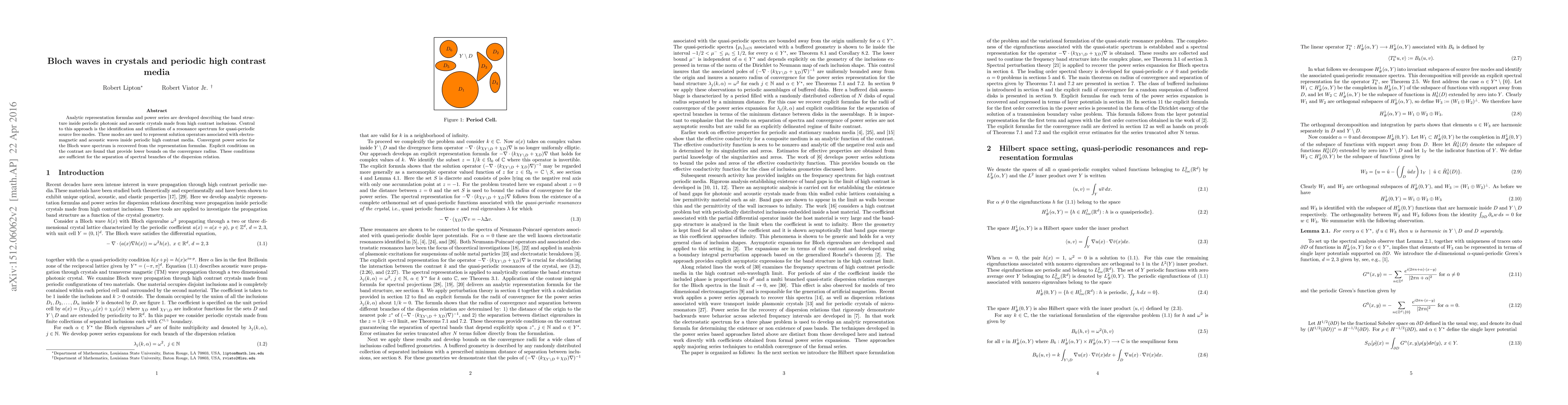 Analytic representation formulas and power series are developed describing the band structure inside periodic photonic and acoustic crystals made from high contrast inclusions. Central to this approach is the identification and utilization of a resonance spectrum for quasi-periodic source free modes. These modes are used to represent solution operators associated with electromagnetic and acoustic waves inside periodic high contrast media. Convergent power series for the Bloch wave spectrum is recovered from the representation formulas. Explicit conditions on the contrast are found that provide lower bounds on the convergence radius. These conditions are sufficient for the separation of spectral branches of the dispersion relation.