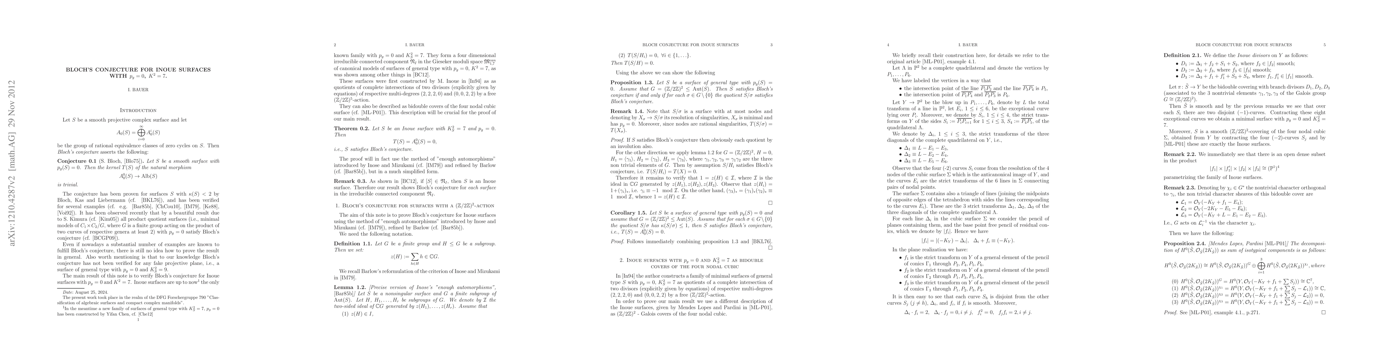 This paper proves Bloch's conjecture for Inoue surfaces characterized by p_g=0 and K^2=7, utilizing the method of "enough automorphisms" from Inose-Mizukami's work to establish that the group of rational equivalence classes of zero cycles of degree zero is trivial.