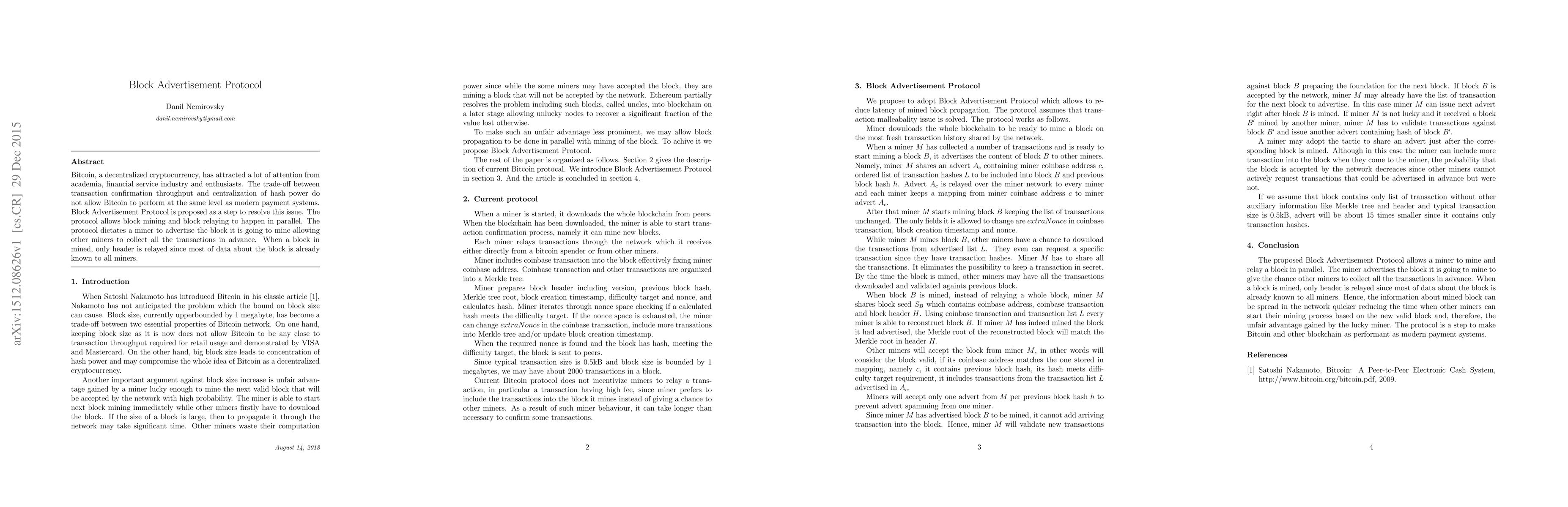 The Block Advertisement Protocol proposes a solution to Bitcoin's performance limitations by allowing parallel block mining and relaying, enabling miners to advertise blocks in advance and reduce data transmission.