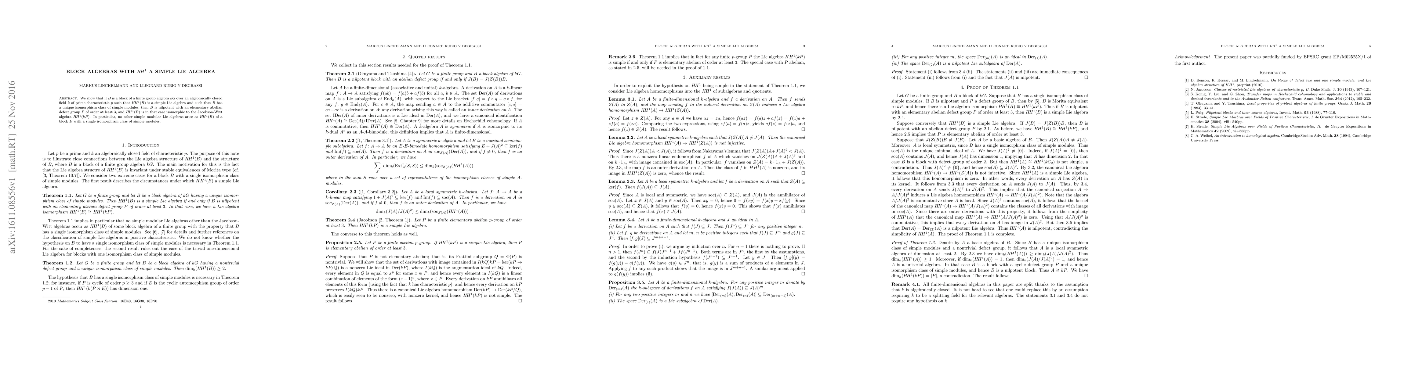 Summary: We demonstrate that a specific block algebra $B$ of a finite group algebra $kG$ with a unique isomorphism class of simple modules and a simple first cohomology group $\HH^1(B)$ is nilpotent and has an elementary abelian defect group $P$ of order at least 3, with $\HH^1(B)$ isomorphic to the Jacobson-Witt algebra $\HH^1(kP)$. No other simple modular Lie algebras can arise under these conditions.