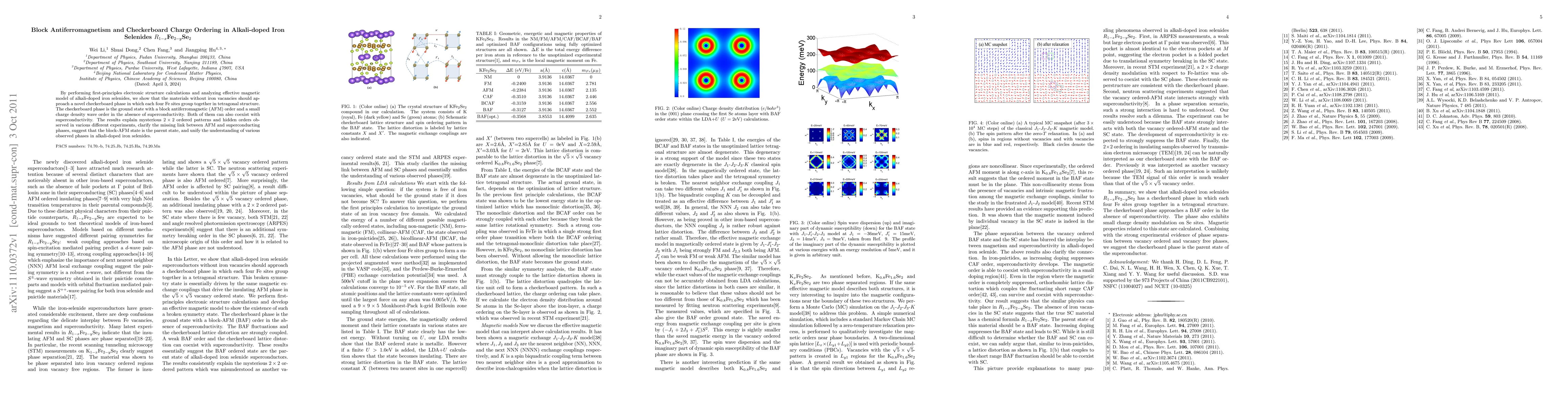 By performing first-principles electronic structure calculations and analyzing effective magnetic model of alkali-doped iron selenides, we show that the materials without iron vacancies should approach a novel checkerboard phase in which each four Fe sites group together in tetragonal structure. The checkerboard phase is the ground state with a block antiferromagnetic (AFM) order and a small charge density wave order in the absence of superconductivity. Both of them can also coexist with superconductivity. The results explain mysterious $2\times 2$ ordered patterns and hidden orders observed in various different experiments, clarify the missing link between AFM and superconducting phases, suggest that the block-AFM state is the parent state, and unify the understanding of various observed phases in alkali-doped iron selenides.