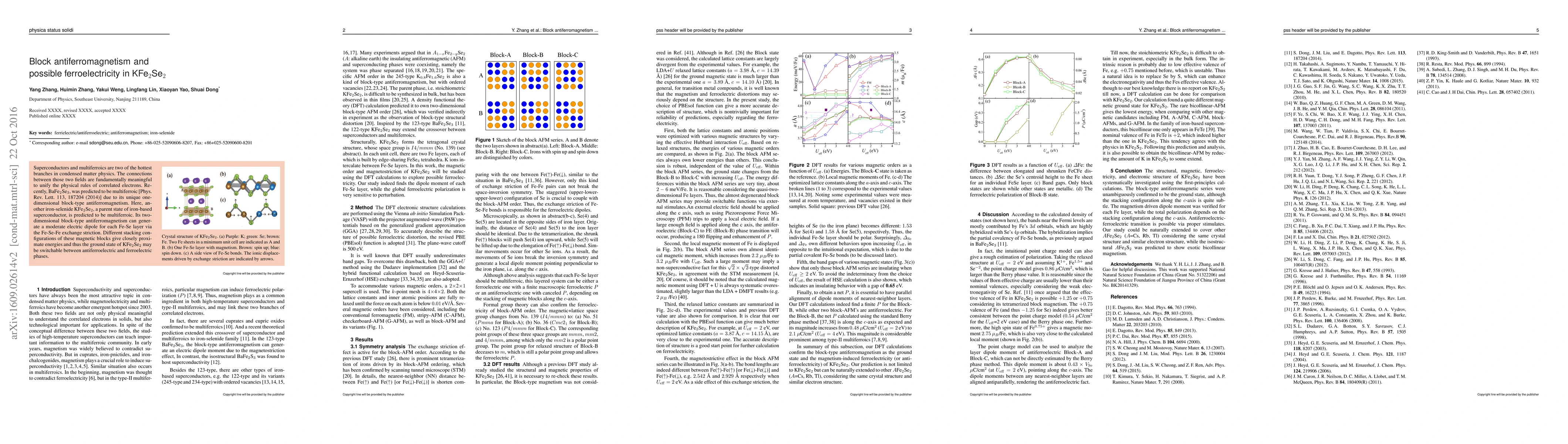 This paper predicts that KFe$_2$Se$_2$ exhibits block antiferromagnetism and could potentially show ferroelectricity due to its unique two-dimensional magnetic structure, suggesting it may bridge superconductivity and multiferroicity in condensed matter physics. The study highlights the switchable nature between antiferroelectric and ferroelectric phases in different stacking configurations.