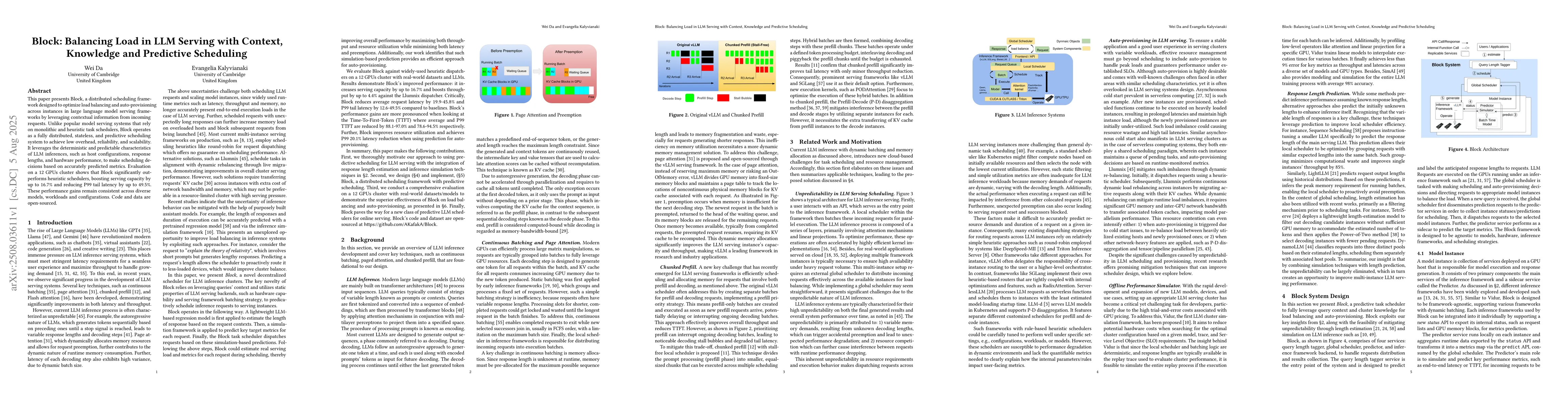 This paper presents Block, a distributed scheduling framework designed to optimize load balancing and auto-provisioning across instances in large language model serving frameworks by leveraging contextual information from incoming requests. Unlike popular model serving systems that rely on monolithic and heuristic task schedulers, Block operates as a fully distributed, stateless, and predictive scheduling system to achieve low overhead, reliability, and scalability. It leverages the deterministic and predictable characteristics of LLM inferences, such as host configurations, response lengths, and hardware performance, to make scheduling decisions based on accurately predicted metrics. Evaluation on a 12 GPUs cluster shows that Block significantly outperforms heuristic schedulers, boosting serving capacity by up to 16.7\% and reducing P99 tail latency by up to 49.5\%. These performance gains remain consistent across diverse models, workloads and configurations. Code and data are open-sourced.