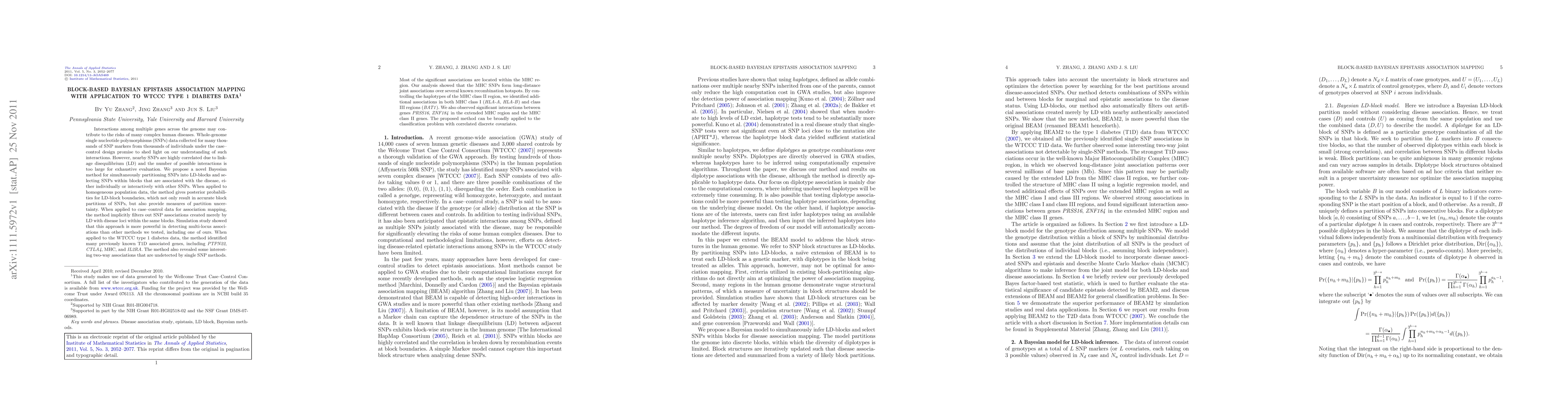 Interactions among multiple genes across the genome may contribute to the risks of many complex human diseases. Whole-genome single nucleotide polymorphisms (SNPs) data collected for many thousands of SNP markers from thousands of individuals under the case--control design promise to shed light on our understanding of such interactions. However, nearby SNPs are highly correlated due to linkage disequilibrium (LD) and the number of possible interactions is too large for exhaustive evaluation. We propose a novel Bayesian method for simultaneously partitioning SNPs into LD-blocks and selecting SNPs within blocks that are associated with the disease, either individually or interactively with other SNPs. When applied to homogeneous population data, the method gives posterior probabilities for LD-block boundaries, which not only result in accurate block partitions of SNPs, but also provide measures of partition uncertainty. When applied to case--control data for association mapping, the method implicitly filters out SNP associations created merely by LD with disease loci within the same blocks. Simulation study showed that this approach is more powerful in detecting multi-locus associations than other methods we tested, including one of ours. When applied to the WTCCC type 1 diabetes data, the method identified many previously known T1D associated genes, including PTPN22, CTLA4, MHC, and IL2RA.