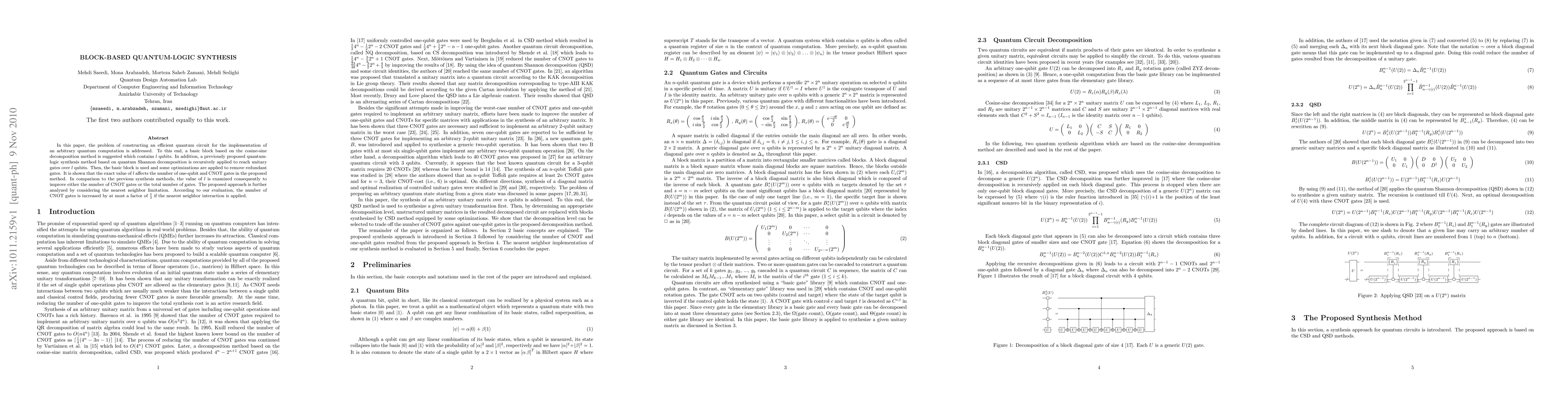 This research proposes a block-based method for efficient quantum circuit construction using cosine-sine decomposition and quantum-logic synthesis. It optimizes the number of one-qubit and CNOT gates by adjusting the value of l, and evaluates the impact of nearest-neighbor interaction limitations, increasing CNOT gates by at most a factor of 5/3.