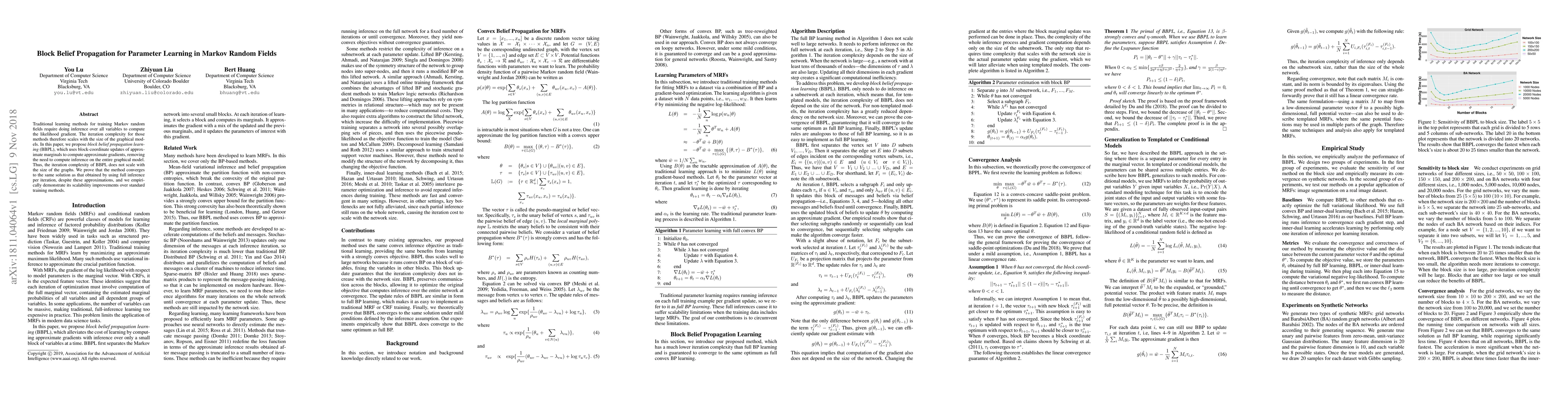 Traditional learning methods for training Markov random fields require doing inference over all variables to compute the likelihood gradient. The iteration complexity for those methods therefore scales with the size of the graphical models. In this paper, we propose \emph{block belief propagation learning} (BBPL), which uses block-coordinate updates of approximate marginals to compute approximate gradients, removing the need to compute inference on the entire graphical model. Thus, the iteration complexity of BBPL does not scale with the size of the graphs. We prove that the method converges to the same solution as that obtained by using full inference per iteration, despite these approximations, and we empirically demonstrate its scalability improvements over standard training methods.