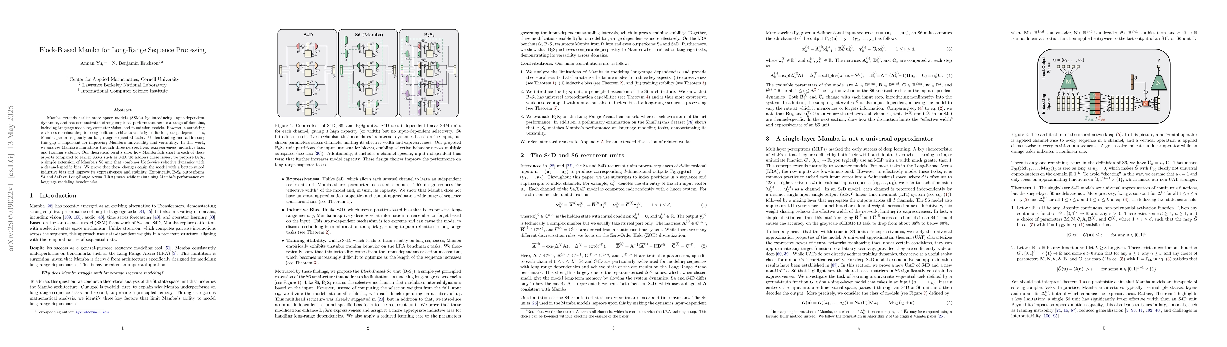 Researchers propose a new model, B2S6, to address the limitations of Mamba, a long-range sequence processing model, by improving its expressiveness, inductive bias, and training stability, leading to better performance on long-range sequential tasks.