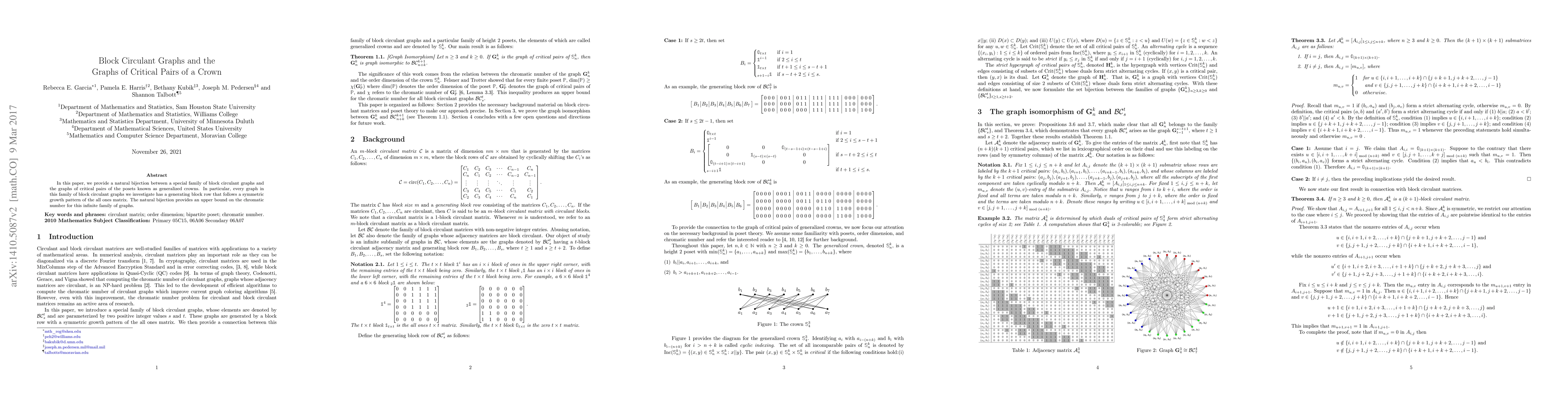 Researchers found a natural bijection between block circulant graphs and graphs of critical pairs of generalized crowns, providing an upper bound on the chromatic number for this infinite family of graphs.