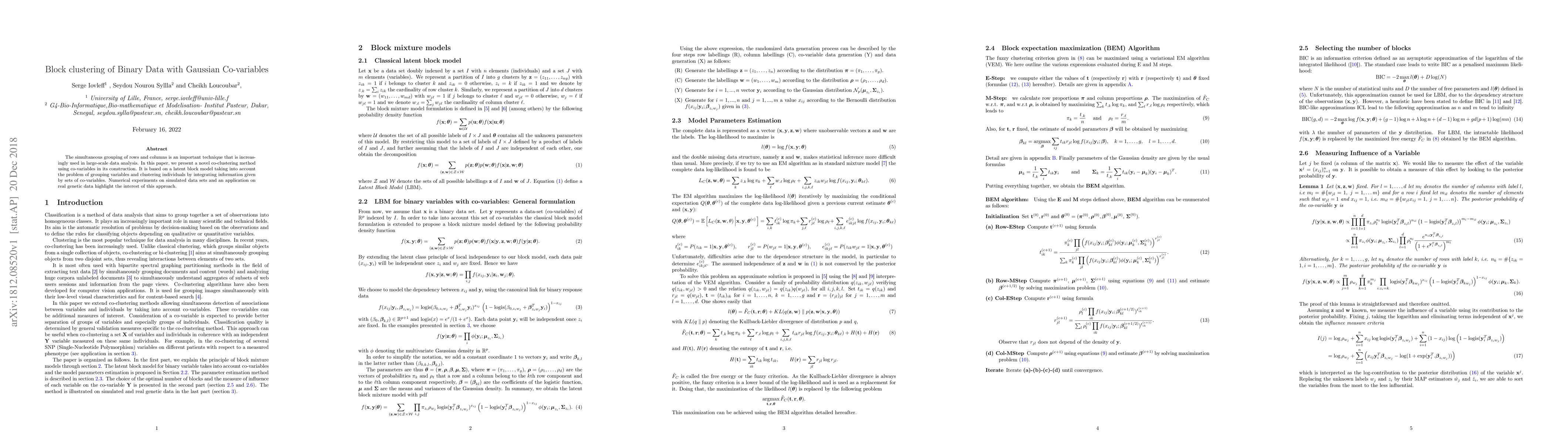 This paper introduces a novel co-clustering method for binary data using Gaussian co-variables, based on a latent block model that groups both rows and columns while integrating co-variable information. Experiments on simulated and real genetic data demonstrate the effectiveness of this approach.