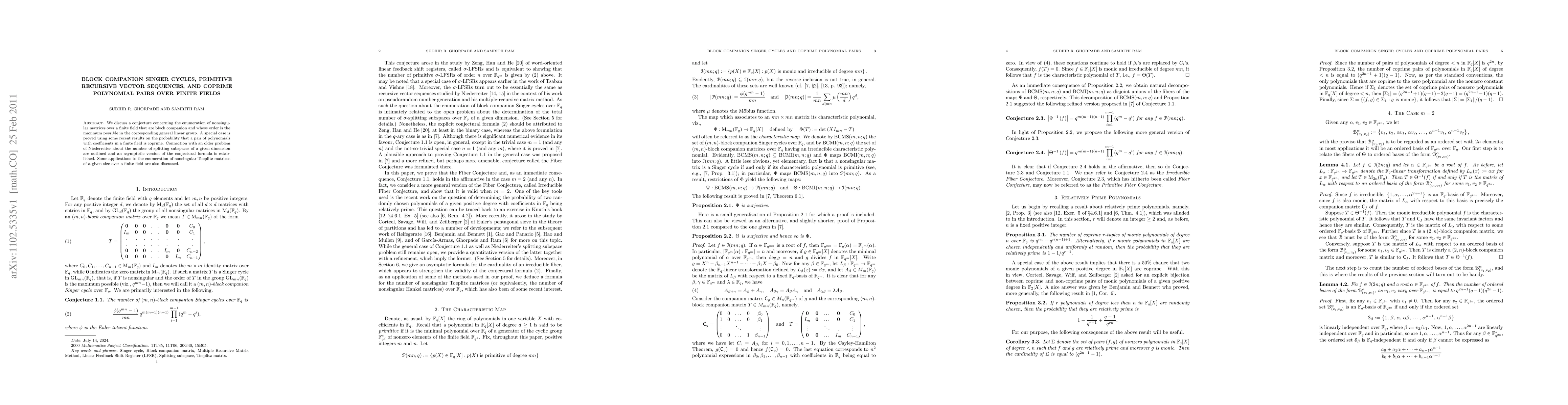 We discuss a conjecture concerning the enumeration of nonsingular matrices over a finite field that are block companion and whose order is the maximum possible in the corresponding general linear group. A special case is proved using some recent results on the probability that a pair of polynomials with coefficients in a finite field is coprime. Connection with an older problem of Niederreiter about the number of splitting subspaces of a given dimension are outlined and an asymptotic version of the conjectural formula is established. Some applications to the enumeration of nonsingular Toeplitz matrices of a given size over a finite field are also discussed.