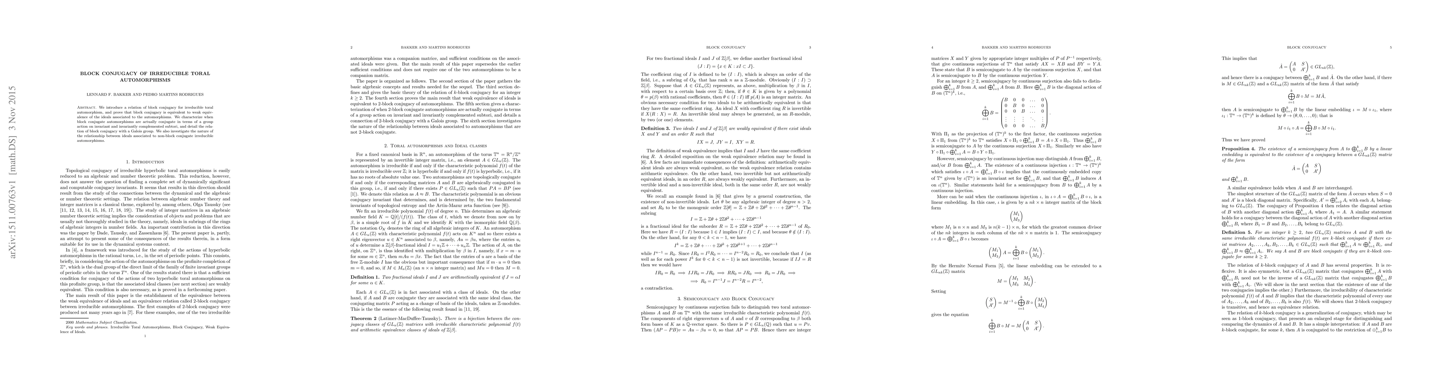 This paper defines block conjugacy for irreducible toral automorphisms, proving its equivalence to the weak equivalence of associated ideals. It further explores conditions under which block conjugate automorphisms are conjugate through group actions on subtori and examines the relationship with Galois groups and non-block conjugate automorphisms.